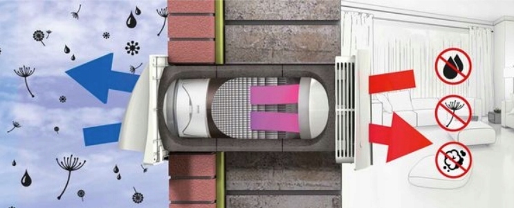 Теплый вытяжной воздух выбрасывается из помещения наружу в течение 70 секунд, одновременно нагревая керамический элемент. Затем устройство меняет направление накачки: теперь свежий воздух поступает снаружи внутрь и нагревается за счет тепла, запасенного в керамическом элементе.
