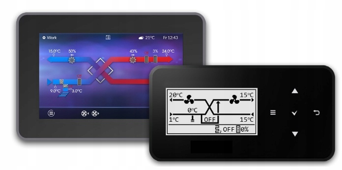 •плавно управляет работой приточных и вытяжных вентиляторов, обеспечивая высокую эффективность рекуперации тепла и воздухообмена в помещениях по программным расписаниям или ручному управлению