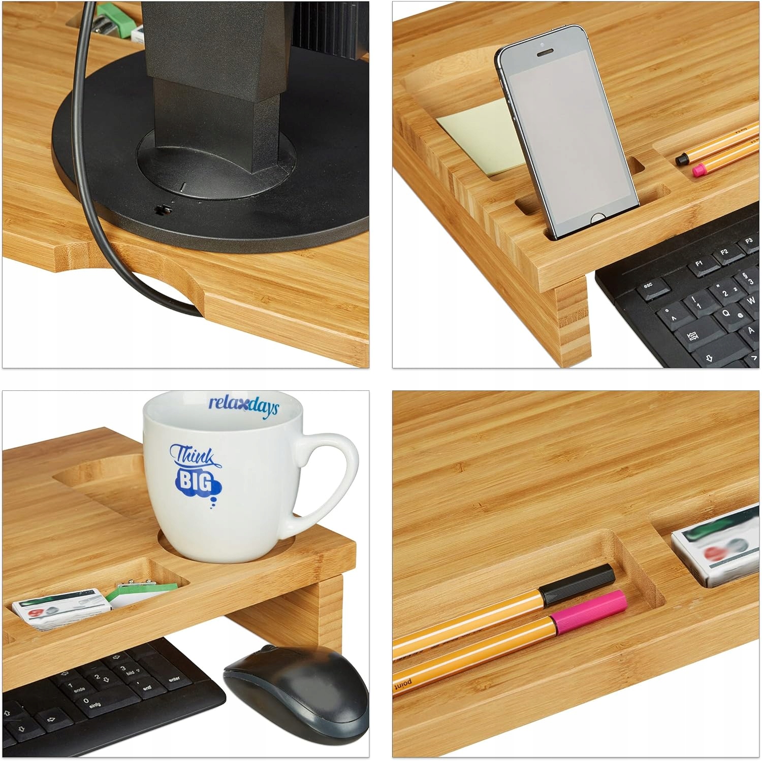 Простая сборка: быстрая сборка функциональной подставки для компьютера с использованием прилагаемого крепежного материала. Обзор: Подставка для ноутбука с полками для планшета, мобильного телефона, письменных принадлежностей или кофейной кружки. Экологичность: бамбуковая подставка для монитора с естественным рисунком зерен — высота х ширина х глубина. ок. 9 х 60 х 30 см. Вертикальное положение: поднятие монитора обеспечивает здоровое и вертикальное положение за столом. Порядок: практичная подставка для монитора с различными небольшими отделениями предотвращает хаос на рабочем месте.