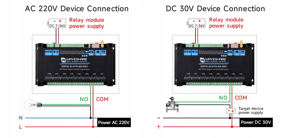 На рисунке ниже показано, как легко можно использовать модуль ESP32‑S3‑ETH‑8DI‑8RO для прямого управления как сетевыми устройствами с напряжением 230 В переменного тока, так и низковольтными приемниками до 30 В постоянного тока: