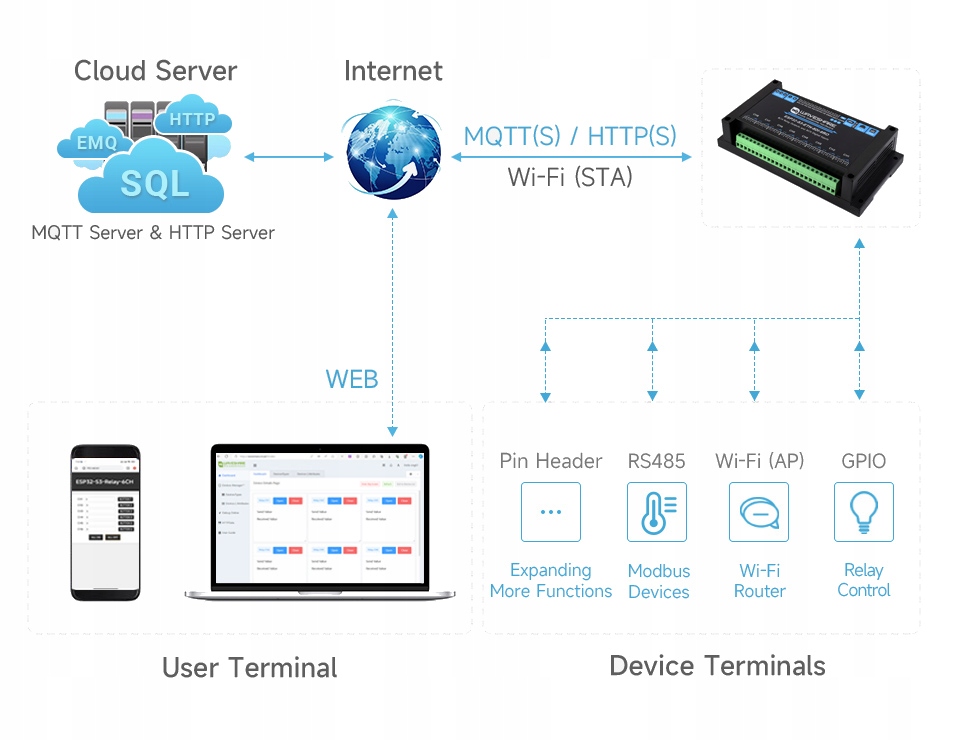 Модуль ESP32‑S3‑ETH‑8DI‑8RO позволяет мгновенно подключить вашу установку к облаку: после настройки режима Wi‑FiStation он отправляет данные на сервер MQTT(S) или HTTP(S) — вы можете использовать собственный экземпляр EMQX, Waveshare.Cloud или любую IoT-платформу, поддерживающую MQTT. В вашем браузере, компьютере или смартфоне вы получаете интуитивно понятную веб-панель для визуализации и управления каждым реле и цифровым входом. Устройство также выполняет функцию локального шлюза: собирает информацию с датчиков Modbus по шине RS485, а через GPIO и контакты-разъёмы позволяет легко добавлять дополнительные модули расширения. При включении режима Wi-FiAP контроллер выступает в роли точки доступа, поэтому вся сеть автоматизации может работать даже там, где нет роутера. В результате один компактный контроллер собирает сигналы от датчиков, управляет реле, предоставляет веб-интерфейс и безопасно публикует данные в облаке — простое решение, сокращающее время внедрения умных домашних и промышленных приложений.