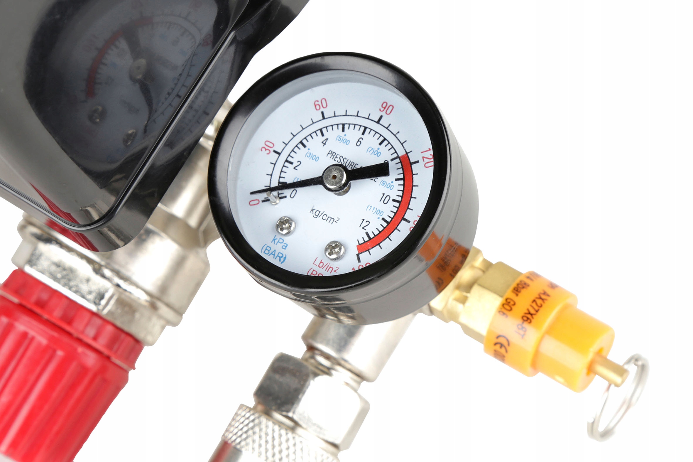 Корпус устройства изготовлен из чрезвычайно прочного пластика, устойчивого к механическим повреждениям и износу. Принцип работы переключателя предельно прост, и его работа состоит из одного переключателя и регулировочного винта, расположенных внутри устройства. Переключатель автоматически отключает компрессор при достижении максимального давления в баке. После использования сжатого воздуха и падения давления до заданного значения переключатель автоматически включает компрессор, который полностью заполняет резервуар. Регулировочная гайка расположена под верхним корпусом и позволяет легко регулировать момент запуска компрессора (понижение или повышение давления в баке). В реле давления также используется редуктор, который используется для снижения давления на одном быстроразъемном соединителе. Регулировка плавная и точная, заданное давление отображается на манометре. Предлагаемый элемент представляет собой комплексное решение, готовое к установке и использованию.