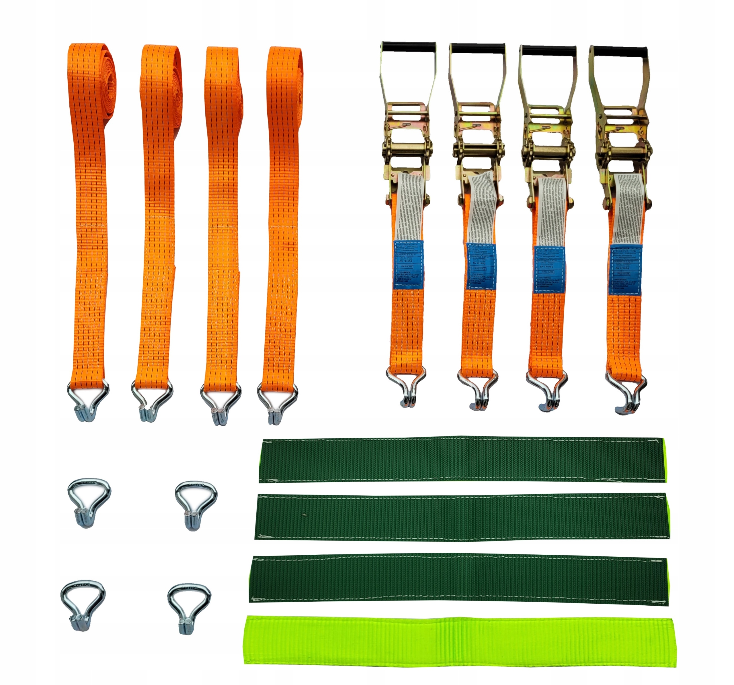 4 натяжителя + 4 ремня + 4 дополнительных защиты - так называемый травяной прорезиненный протектор высочайшего качества + 4 двухпальцевых крючка