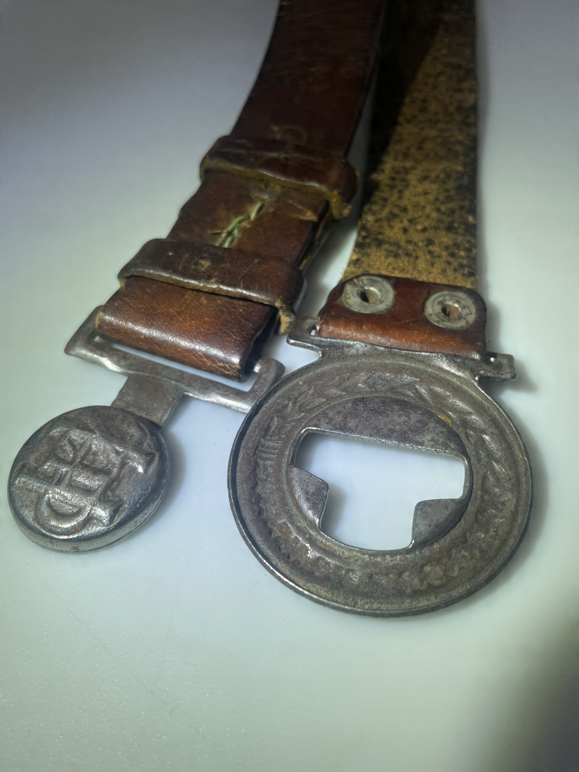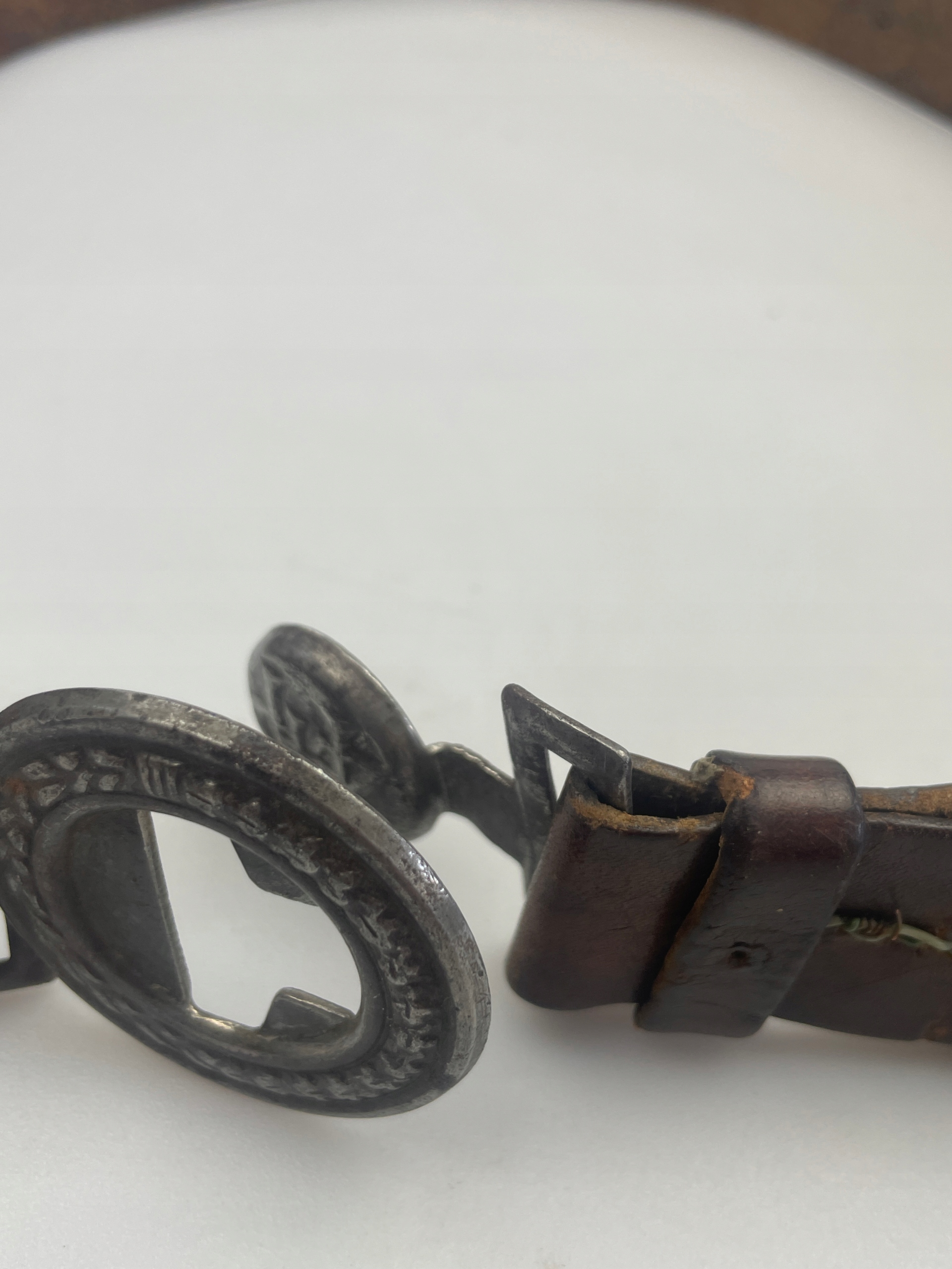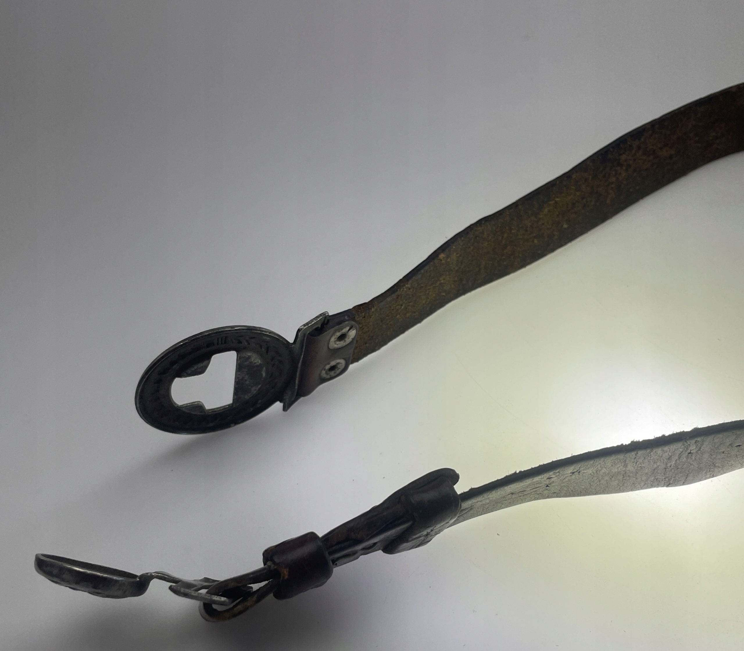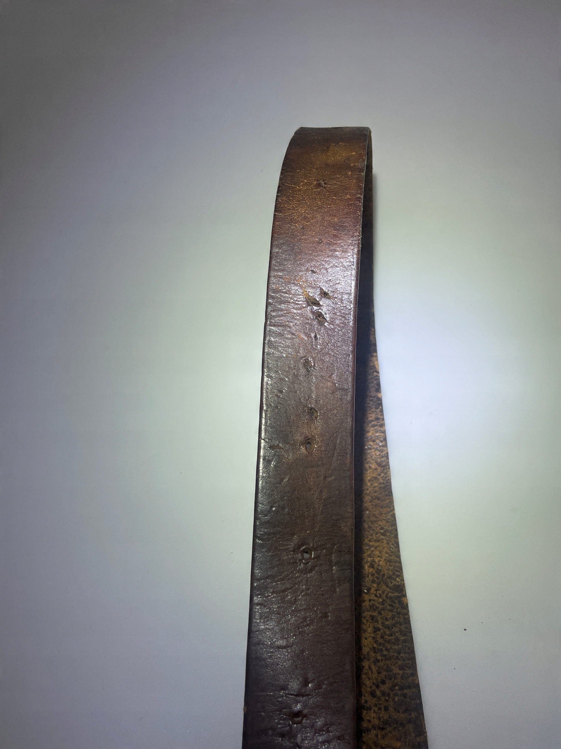 Состояние видно на фотографиях, ремень поврежден, отремонтирован легкой ниткой рядом с пряжкой, в нем пробиты дополнительные отверстия.