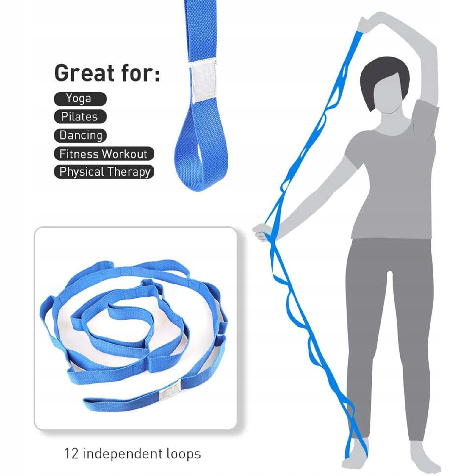 Ремешок для йоги, эластичный ремешок, 12 петель, неэластичный для фитнеса, гимнастики, спорта, синий