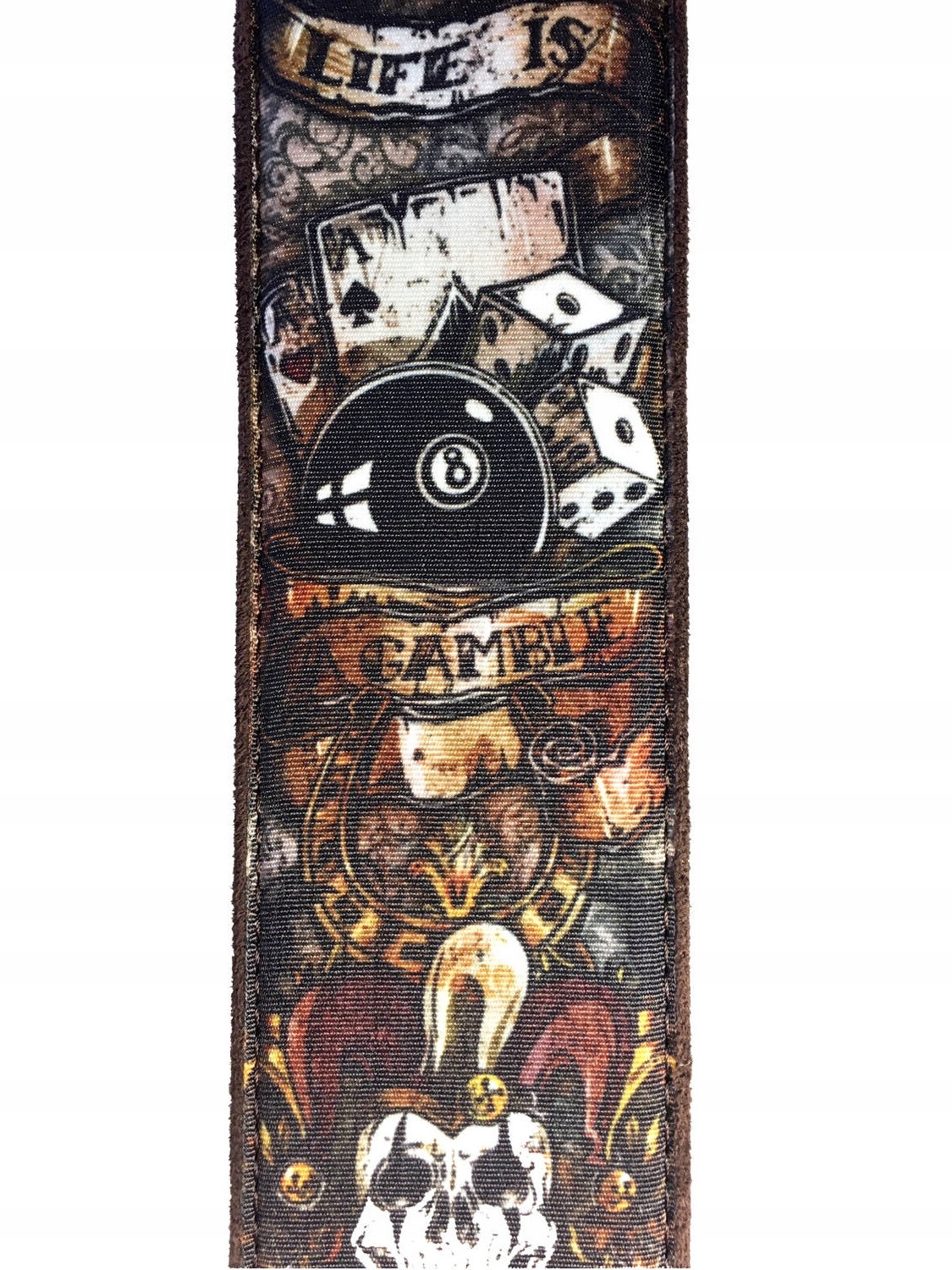 Ремешок для гитары с уникальным характером. Ее лейтмотив – случайность, а по всей длине полосы расположены гравировки игральных костей, покерных карт и бубнов. Эти красивые узоры созданы художницей Ксанией Грей, сотрудничающей с RightOn Straps.
