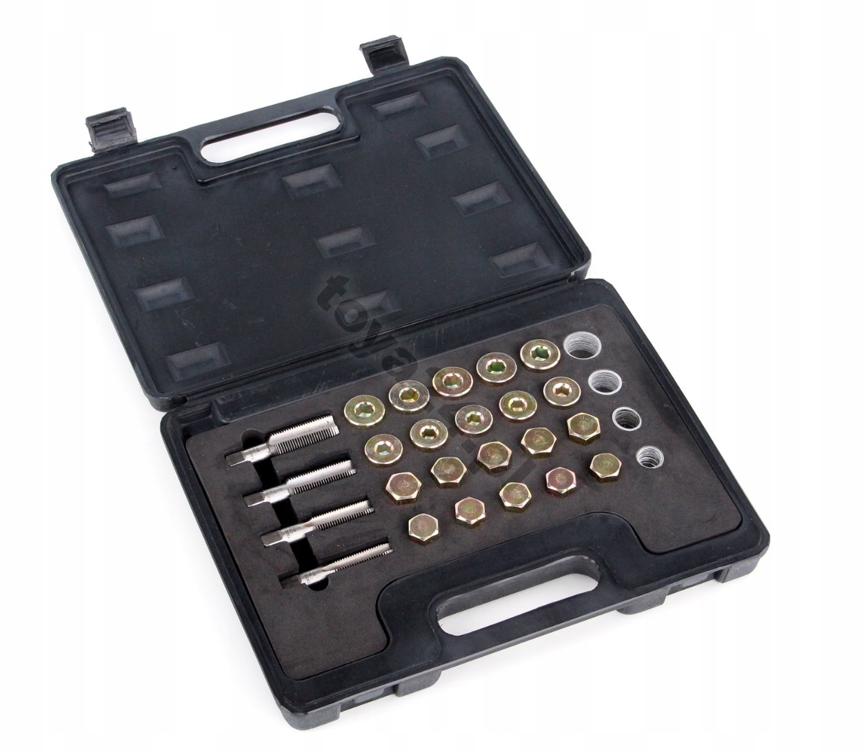 Ремкомплект пробки масляного поддона Yato. Предназначен для ремонта поврежденных масляных крышек. Набор рассчитан на четыре типа резьбы: М13, М15, М17, М20. Краны одноступенчатые из стали HSS, в комплект каждого размера входят 5 пробок масляного поддона и 10 шайб. Нарезав резьбу в масляном поддоне, установите заглушку из комплекта. Набор для использования в слесарных, слесарных и автомобильных мастерских.