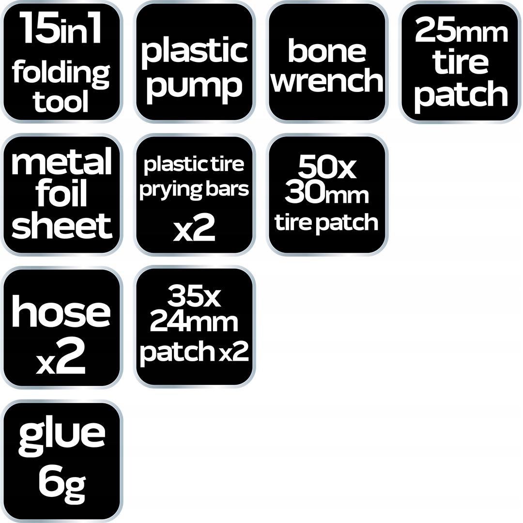 Ремкомплект велосипеда 91-013 от NEO состоит из сумки из полиэстера 1680D, застегивающейся на практичную молнию. Чемодан размерами 23 х 15 х 6 см можно прикрепить к раме велосипеда с помощью ремней-липучек. В набор входят такие полезные инструменты и элементы, как: насос, рычаги для шин, металлический шестигранный ключ, велосипедный мультитул, заплатки для трубок, силиконовые шланги, клей и съемник. Ремонтный комплект для велосипеда от бренда NEO поможет в любой экстренной ситуации.