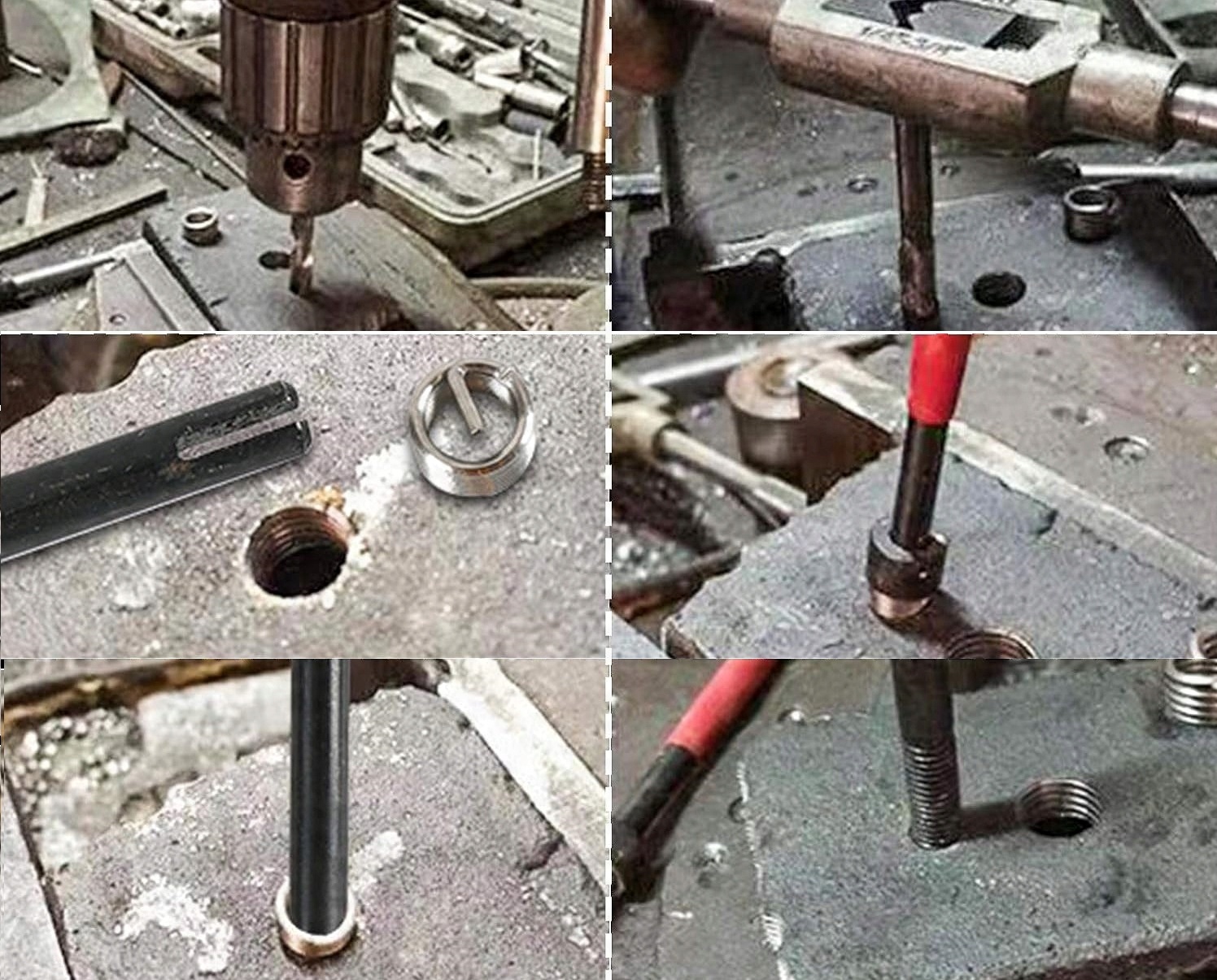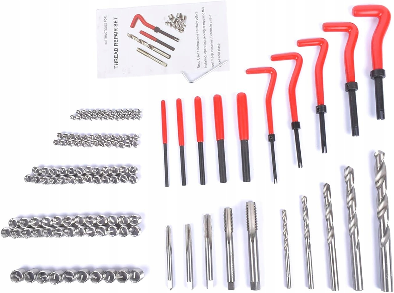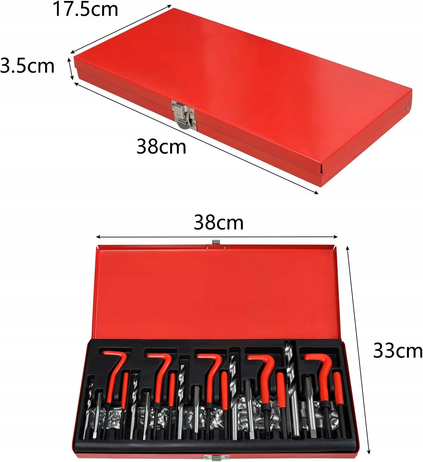 - Универсальность: набор содержит инструменты для ремонта резьбы различных размеров, от M5 до M12, что делает его чрезвычайно универсальным.