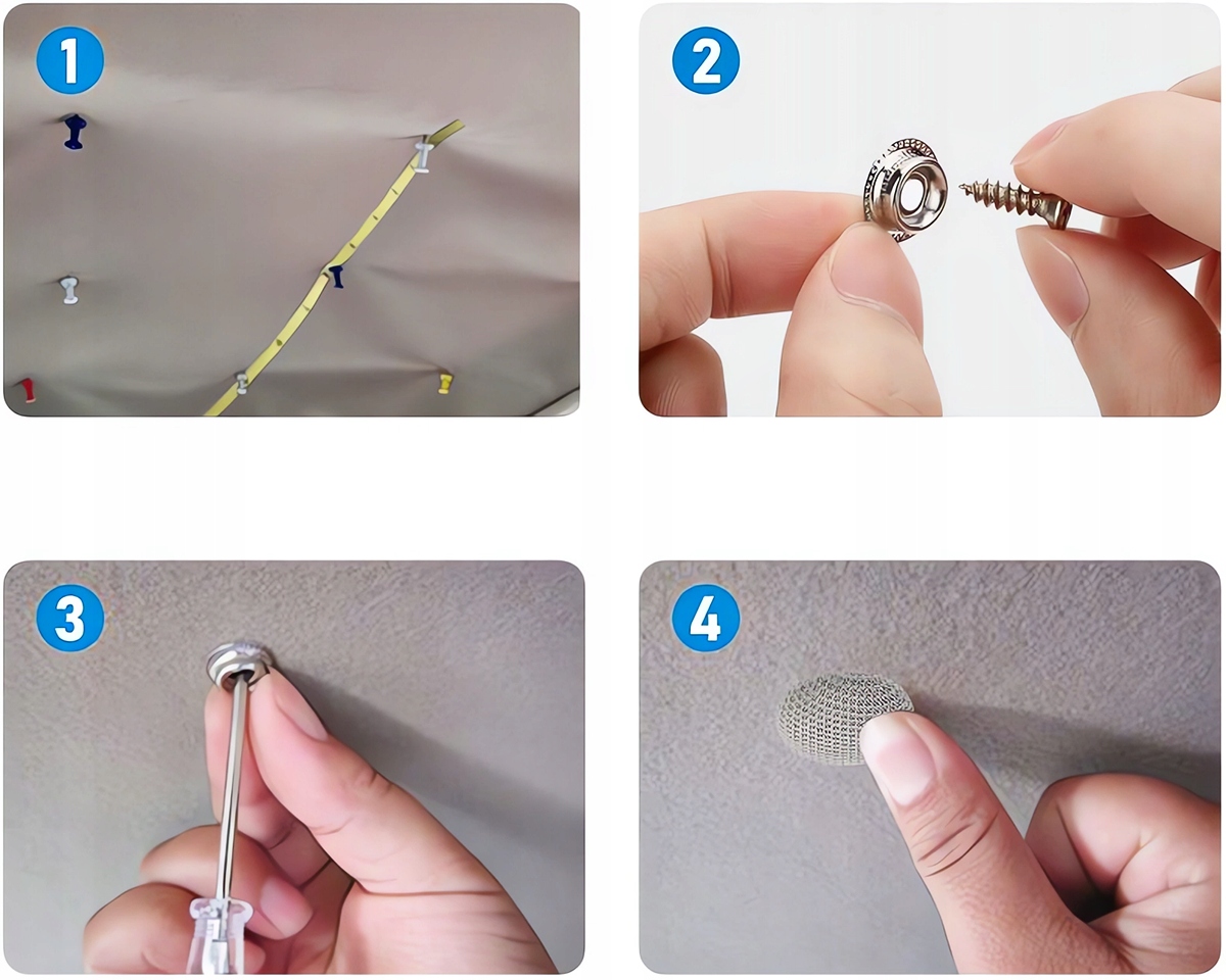 - Удобная сборка: Сборка набора проста, в комплект входит отвертка в помощь. Просто отметьте место, где вы хотите прикрепить заклепку, а затем прикрепите ее с помощью отвертки. Рекомендуемое расстояние установки — 10–15 см.