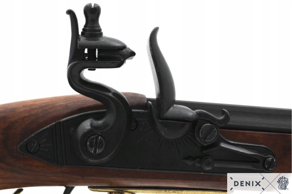 Репродукция кремневой винтовки, сделанной из металла и дерева, с имитацией заряжания и ударно-спускового механизма.