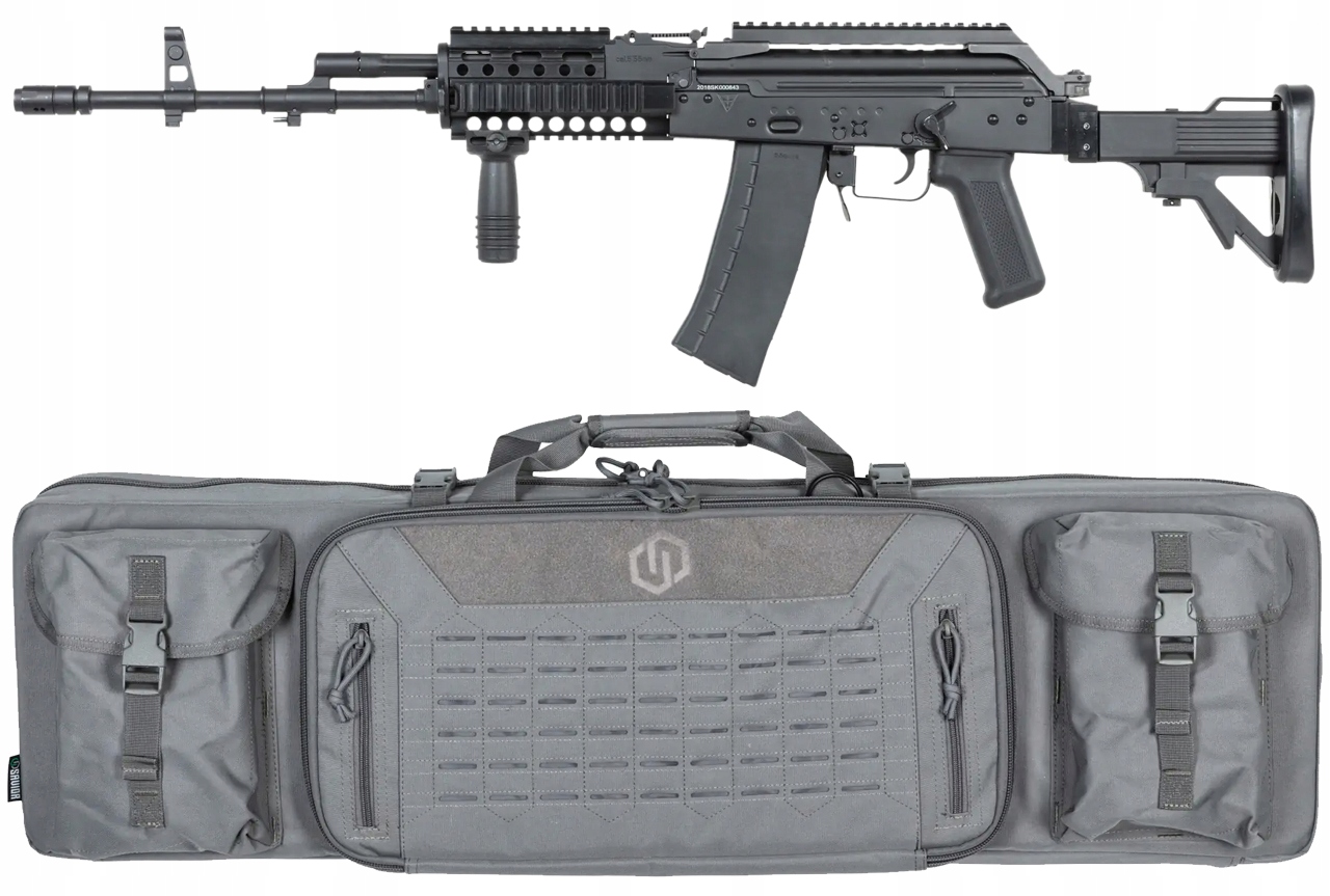 Внутренняя конструкция на основе надежной коробки передач V3 с 8 мм подшипниками и точной стволой с длиной 500 мм обеспечивает очень хорошую производительность и повторение снимков. Реплика была изготовлена из комбинации стали, алюминия и прочного пластмасса, что гарантирует надежность и в то же время не мешает динамичной игре. Набор также включает в себя высококачественное транспортное покрытие с системой MOLLE, перегородками и защитными ремнями, что позволяет удобно переносить реплики и дополнительное оборудование.
