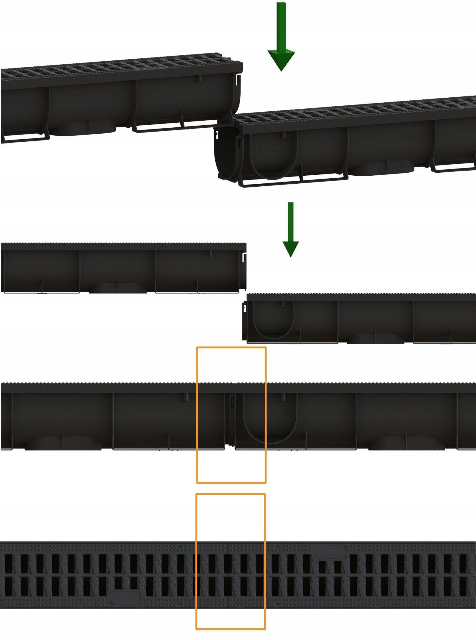 Элементы линейной водоотводной системы соединяются хомутами, очень легко и быстро монтируются.