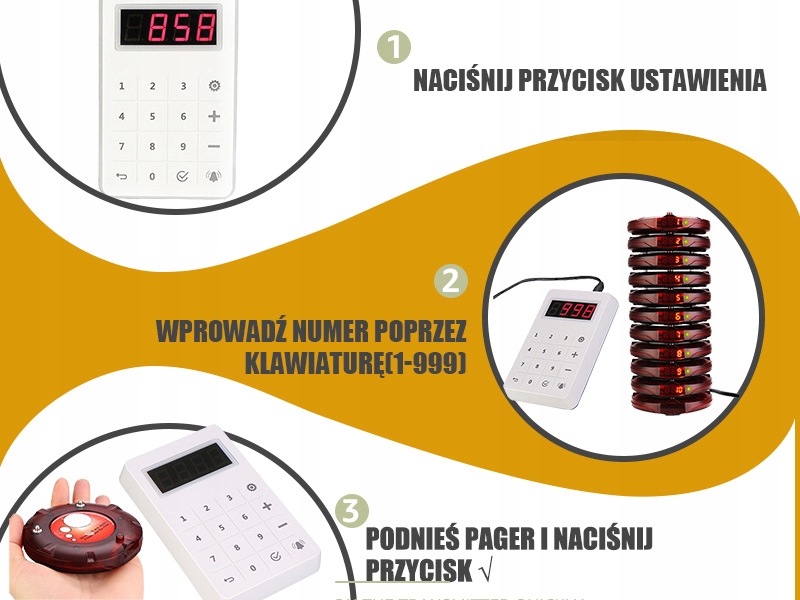 - Независимая клавиатура передатчика; клавиатура отдельная; звуковой сигнал пейджера поддерживает несколько окон; на ресепшене можно разместить пейджеры и попросить официанта раздавать их клиентам; и отправить клавиатуру на кухню; когда еда готова; повар нажимает соответствующий номер пейджера; попросить клиента забрать еду.