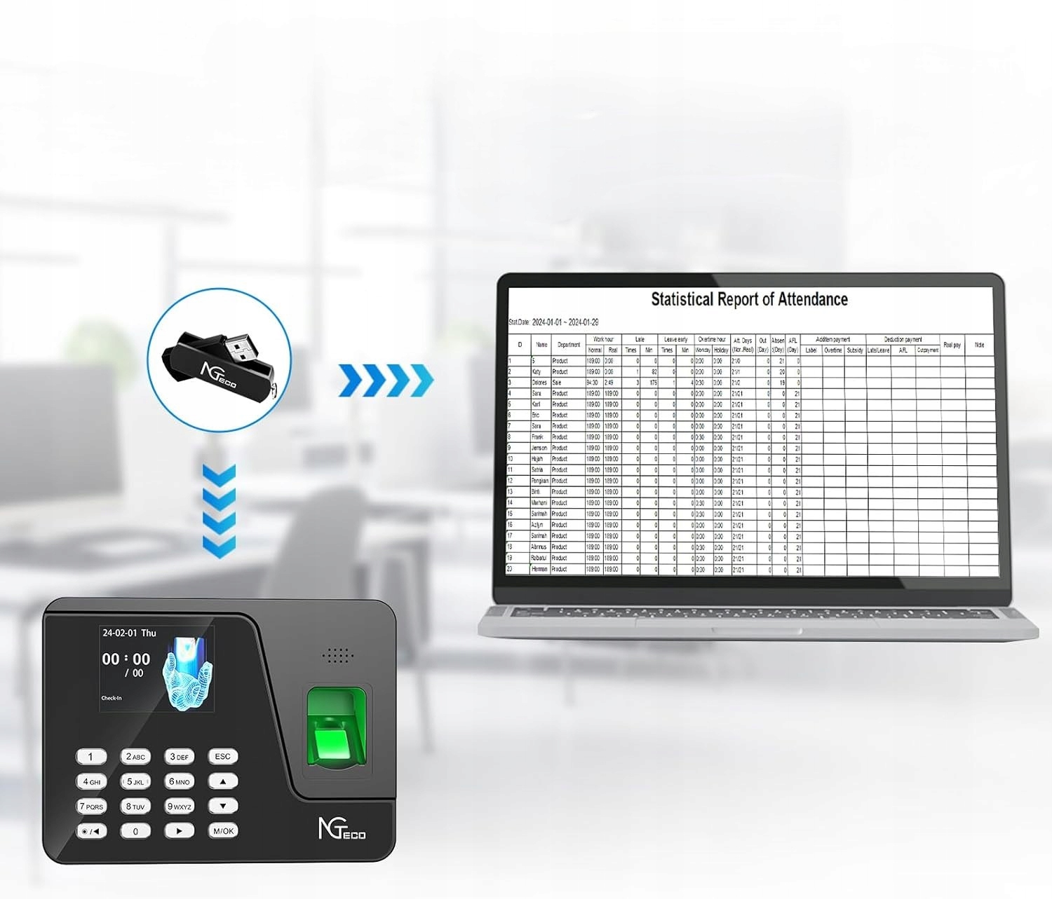 - Автономное использование: интеллектуальный автономный считыватель времени и посещаемости без сложного программного обеспечения. Загрузка и выгрузка данных через USB-накопитель. Формат отчета – Excel. Поддерживаются только фиксированные часы смены.