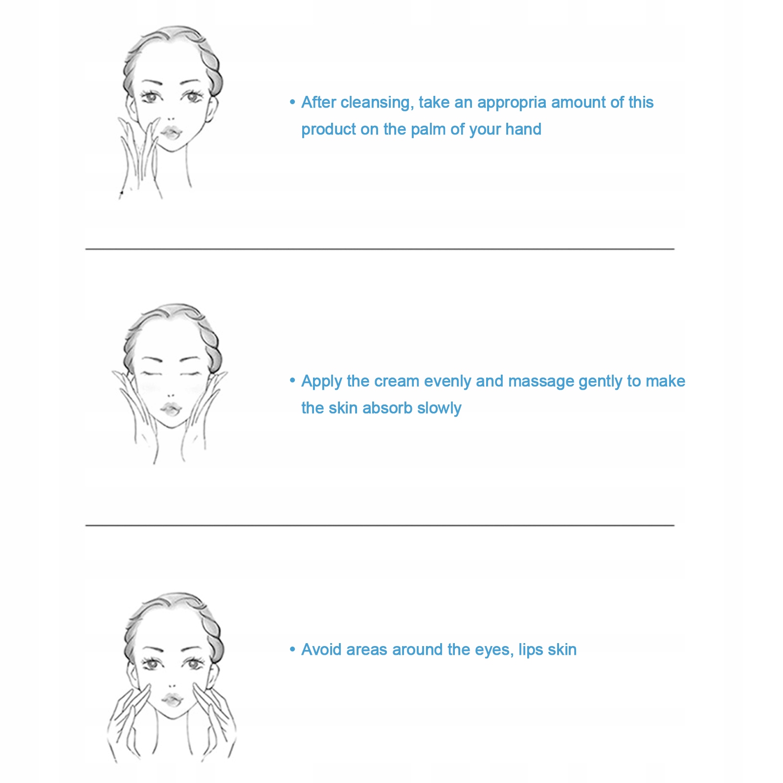 4, прост в использовании: после очищения нанесите необходимое количество крема на кожу и аккуратно помассируйте, чтобы облегчить впитывание, избегайте глаз, губ и кожи вокруг глаз.