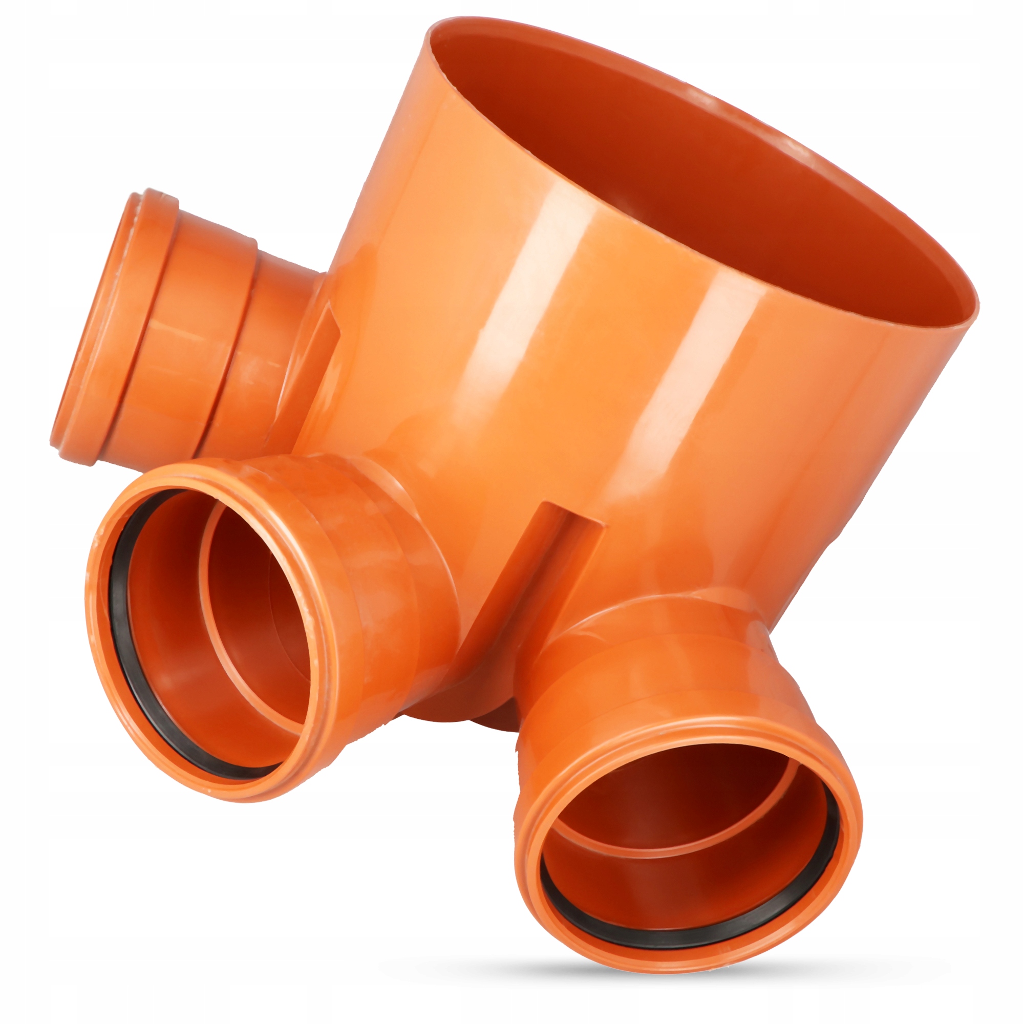 Цоколь также оборудован отверстием для гофрированной трубы Ду 315 и 3-мя вводами для канализационных труб диаметром 160 мм, расположенными под углом 45 градусов. Все вводы труб имеют прокладки, что влияет на качество соединения.