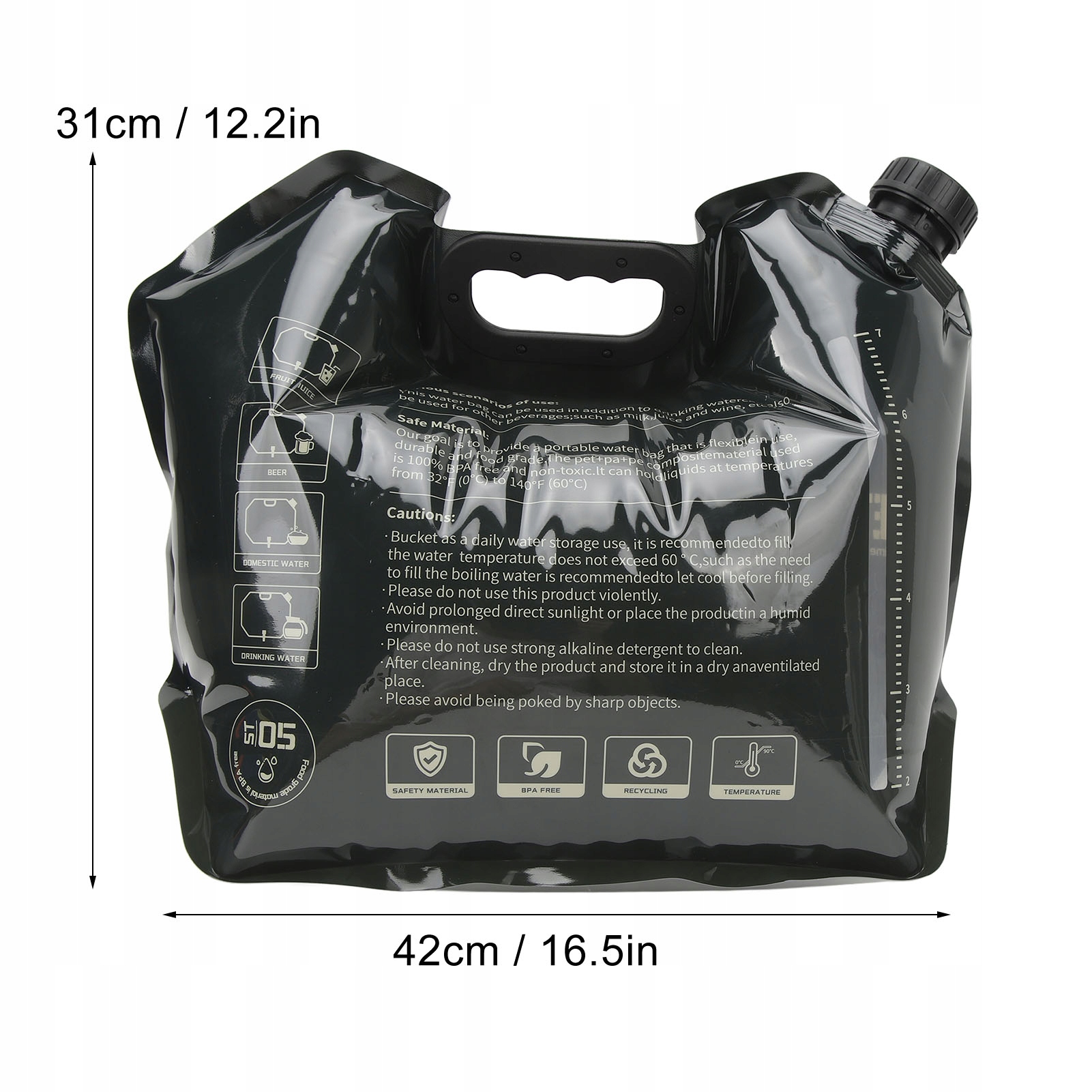 4. Пищевые материалы: мешок для хранения воды изготовлен из материалов, предназначенных для контакта с пищевыми продуктами, и не содержит бисфенол А, который обеспечивает безопасность питьевой воды. Он подходит для многоразового использования, он свободен от загрязнения и запахов, так что вы можете наслаждаться этим в мире на открытом воздухе.