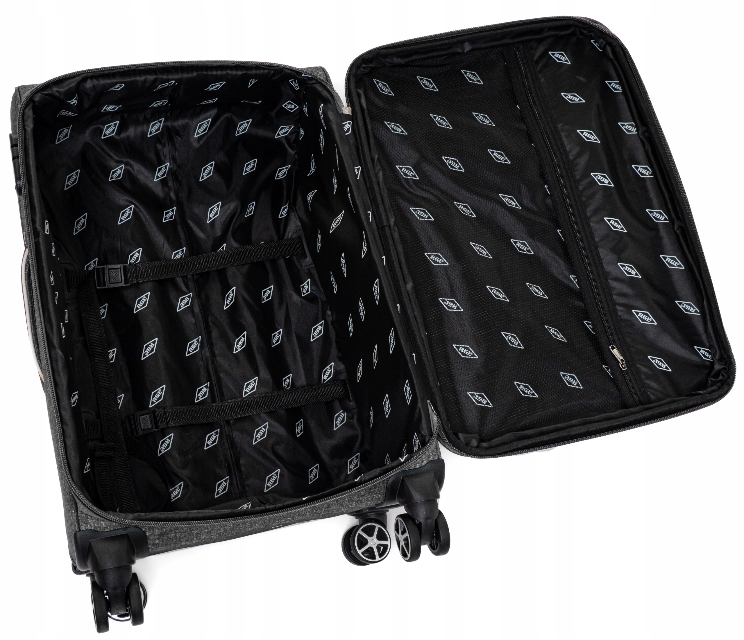 Внутренняя часть чемодана отделана прочной подкладкой с логотипом RGL, имеются ремни, защищающие наши вещи от перемещения.