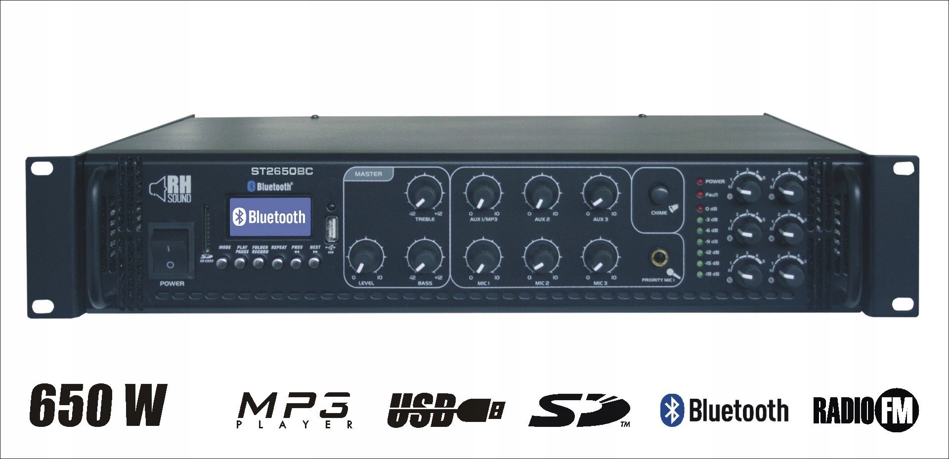 Радио усилитель. Universal, который используется в качестве поставки звуковых систем во всех общественных учреждениях, отелях, ресторанах, офисах, коммерческих и священных офисах. Современный звуковой блок с MP3 -плеер, FM -тюнер и Bluetooth -соединение. Высокая выходная мощность 650 Вт и разделение на 6 независимых и регулируемые с точки зрения объема зон динамиков позволяет управлять системами, звучащими на больших поверхностях. Входные данные: 3 X MIC (Mic -Priority), 3 X Aux, встроенный -ин -в MP3 -плеер -данные из внешней USB -памяти или SD -карты и Bluetooth Connection. Уровень выходного сигнала главного объема, коррекция соединения низких и высоких тонов. Все с пультом дистанционного управления.