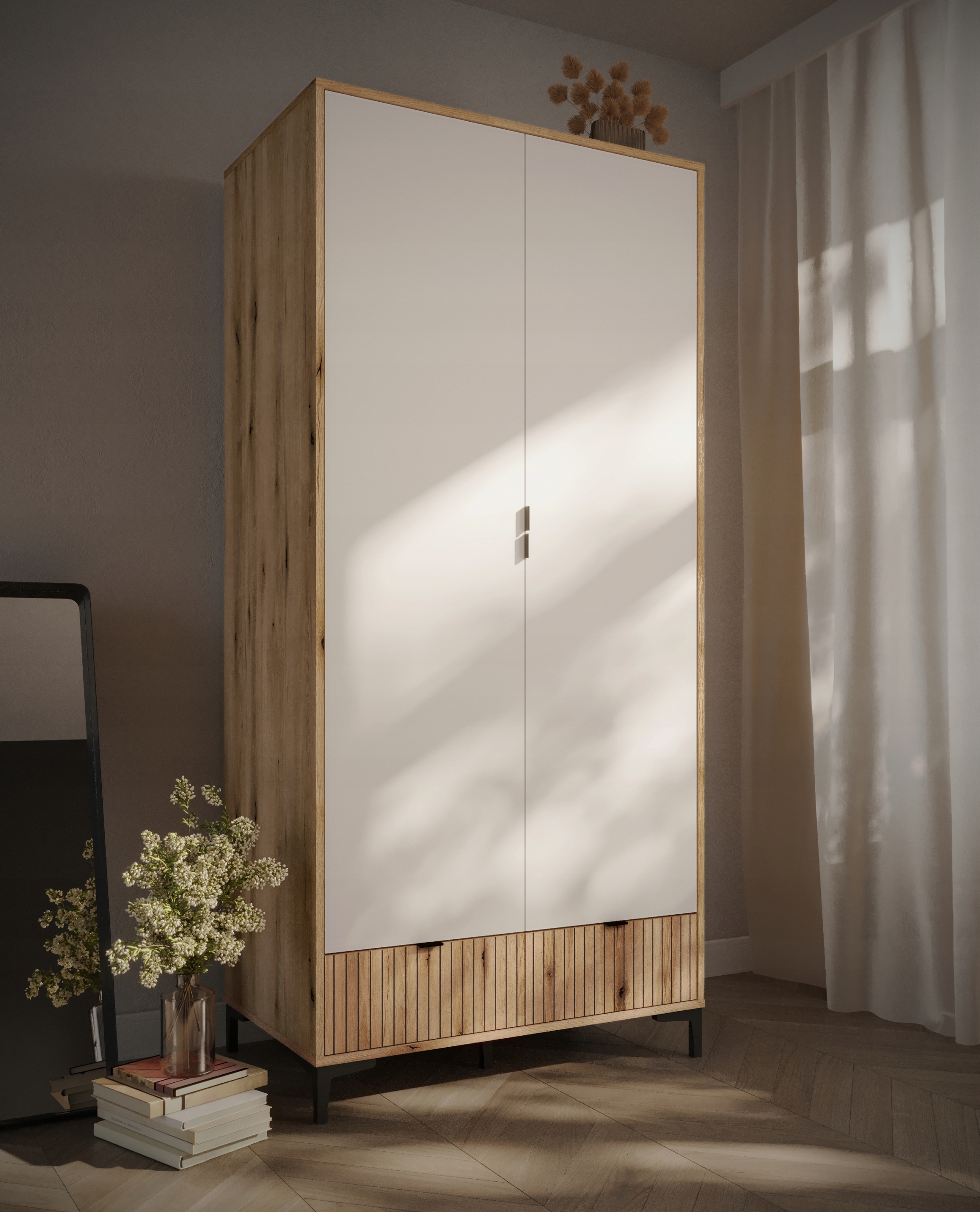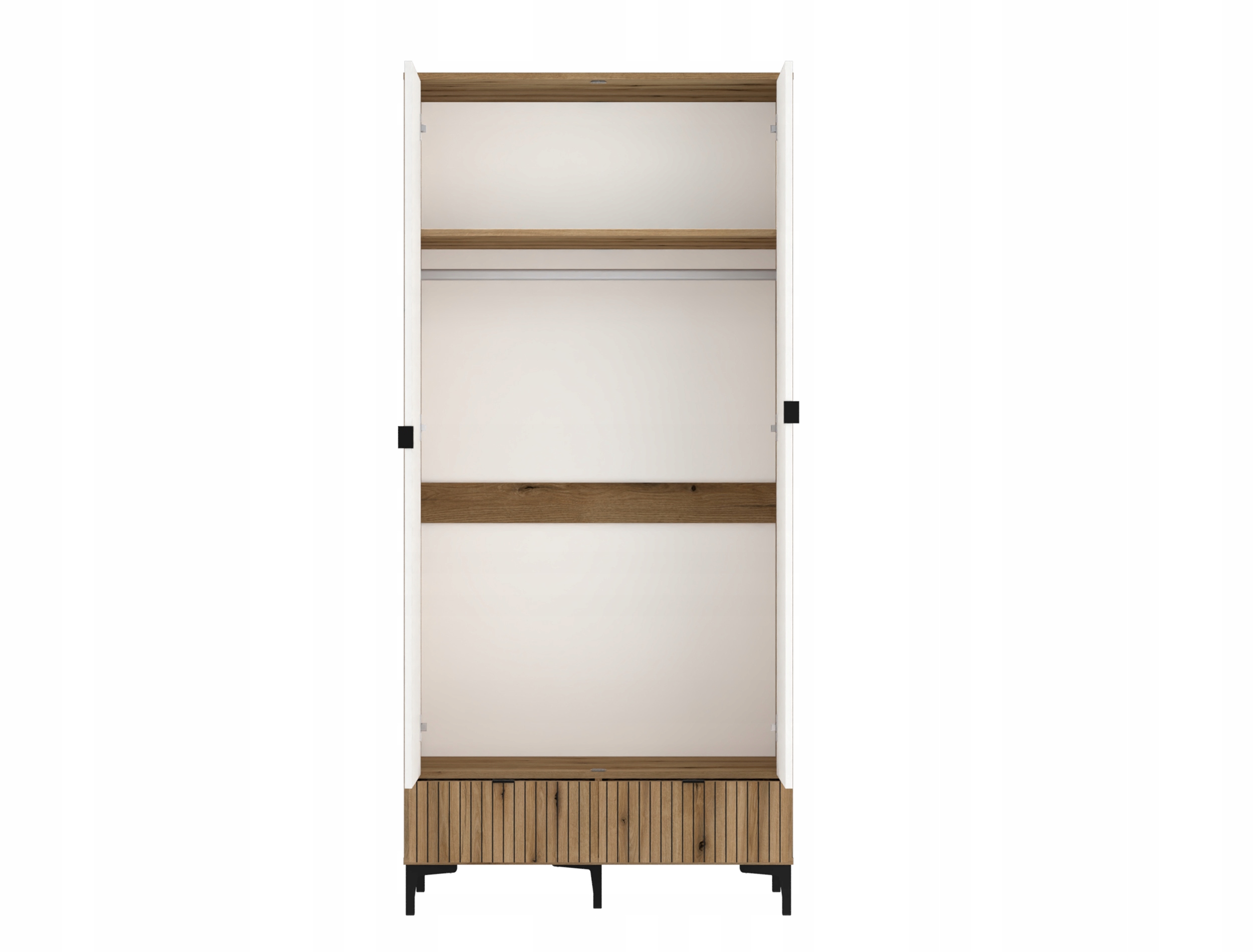 - Двухвурный гардероб Ricko с ящиком представляет уникальный стиль, смешиваясь с расположением промышленного стиля, скандинавским, скандинавским стилем, эклектичным и винтажным скандалом. Мебель на высоких ногах, сделанная из пластика, впечатляет визуальной легкостью. Это подчеркивается комбинацией белого с естественным оттенком дерева и рифленным элементом, полученным благодаря цифровой печати. Интерьер гардероба был разработан с широкой палкой для висящей одежды и вместительной полкой. В ящике с реразрушенным фронтом есть шариковой механизм, обеспечивающий полную мебель, имеющую место для хранения висящей одежды, расположенной на полке, нижнем белье и аксессуарах, расположенном в ящике, вы можете интегрировать в декор жилых комнат, молодежных и студийных квартир. Он отлично подходит для организации ламеллы и современных интерьеров, в которых доминирует минимализм. Простые геометрические фигуры и вневременные цвета гарантируют универсальность использования с частыми изменениями в стиле и цветах аксессуаров в комнате.