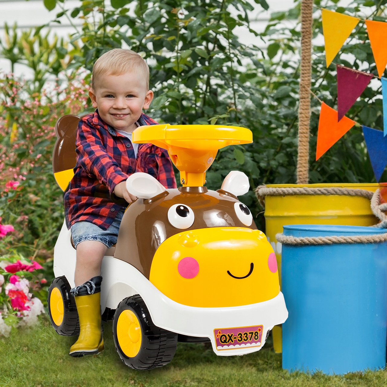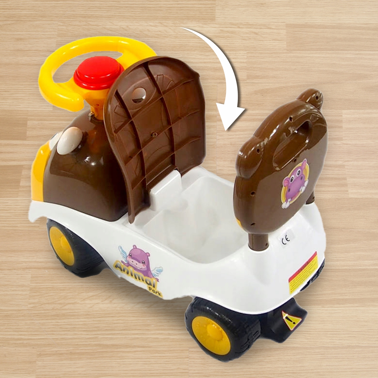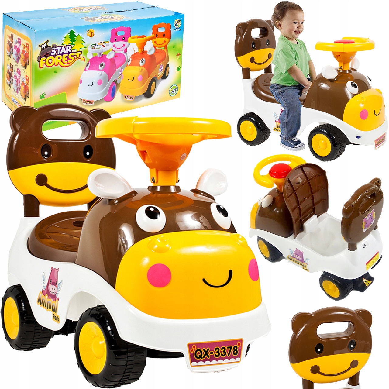 Симпатичная на вид корова с улыбающейся мордашкой доставит массу удовольствия вашему ребенку. Он оснащен вещевым отделением под сиденьем, звуковым сигналом на руле и удобным сиденьем со съемной спинкой.