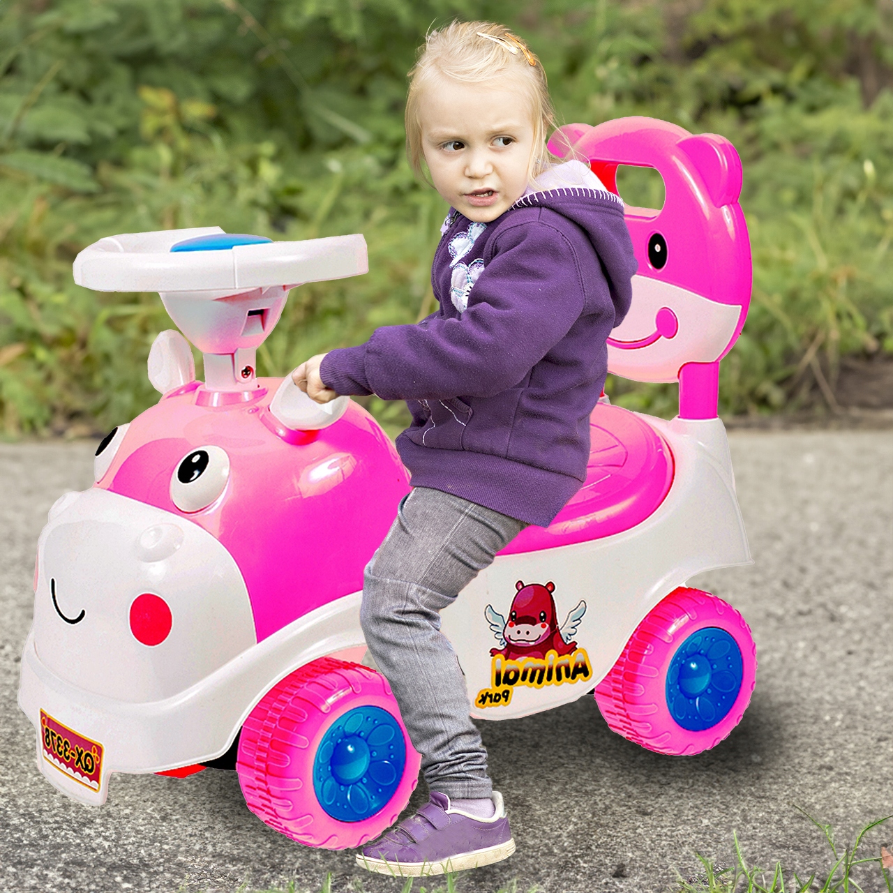Симпатичная на вид корова с улыбающейся мордашкой доставит массу удовольствия вашему ребенку. Он оснащен вещевым отделением под сиденьем, звуковым сигналом на руле и удобным сиденьем со съемной спинкой.