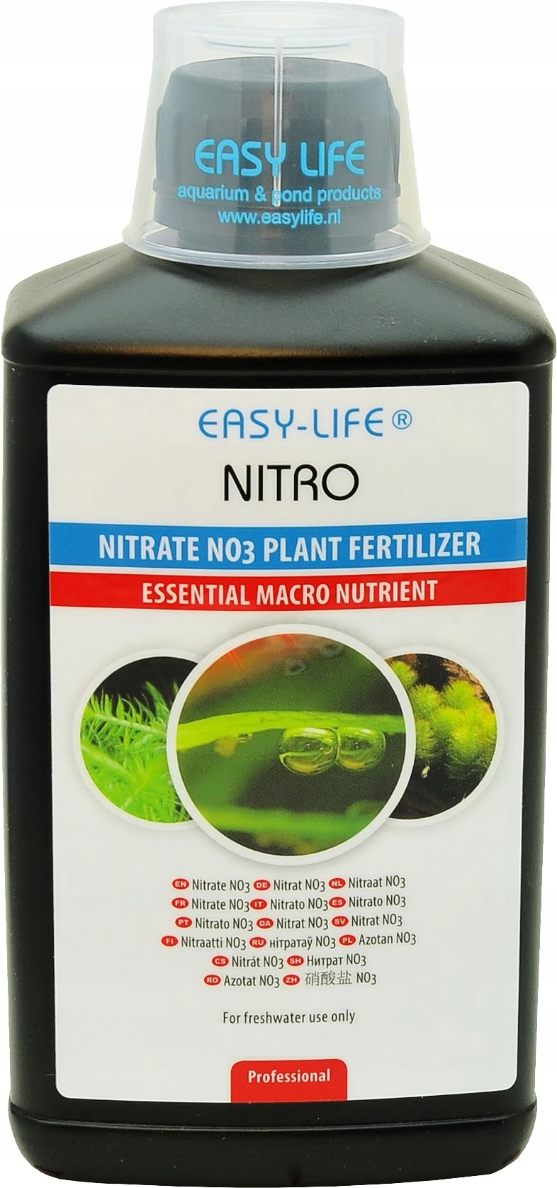 Nitro - это концентрированное азотное удобрение (NO3) с калием (K). Необходимо в каждом заводе. Благодаря этому кондиционеру растения растут быстрее, не теряют старые листья, не «придерживайтесь» на свет, и, прежде всего, выглядят здоровыми и красивыми. Это очень стабильное удобрение без фосфатов. Рекомендуемый уровень нитратов NO3 в воде составляет 10-20 млрд. Чм.