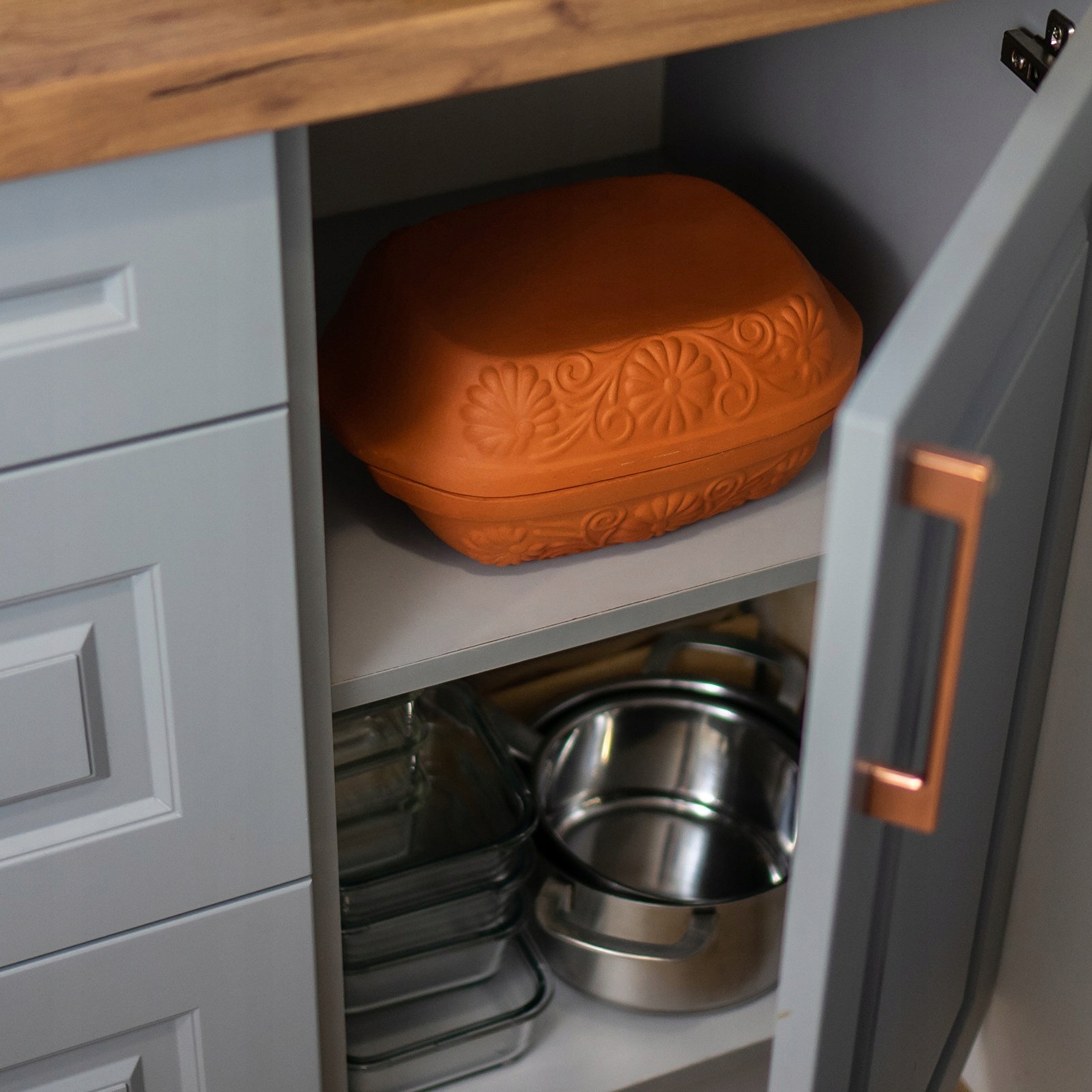 После использования кастрюлю следует несколько раз замочить в теплой воде, а затем промыть губкой или мягкой щеткой. Более сильные загрязнения можно удалить с помощью пищевой соды. Время от времени стоит прокипятить кастрюлю в воде с уксусом, чтобы нейтрализовать запахи. Кастрюлю нельзя мыть в посудомоечной машине.