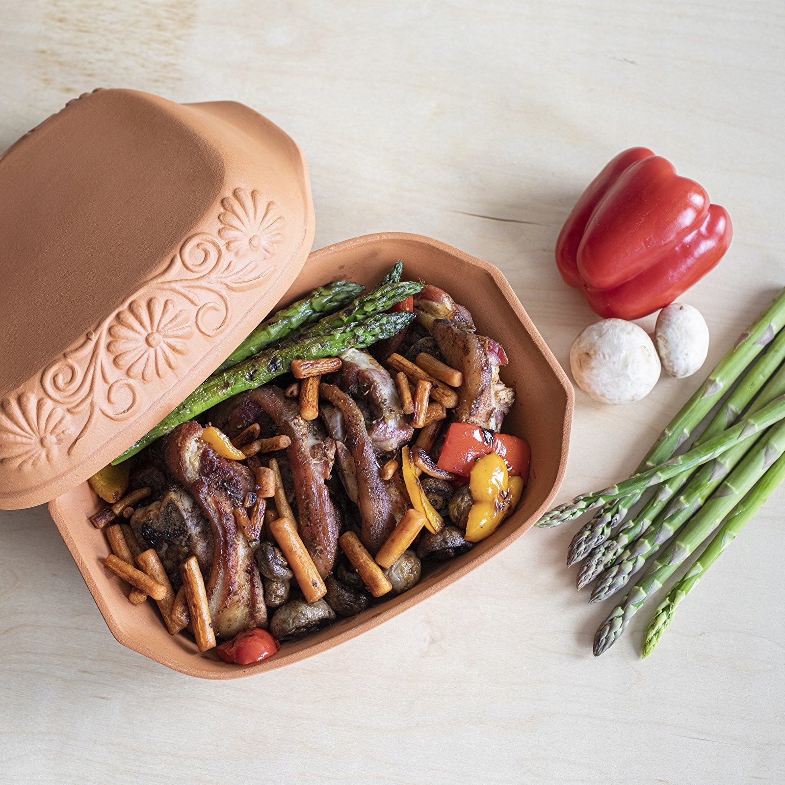 Римский горшок изготовлен из натуральной глины. Его свойства позволяют запекать продукты в атмосфере пара.