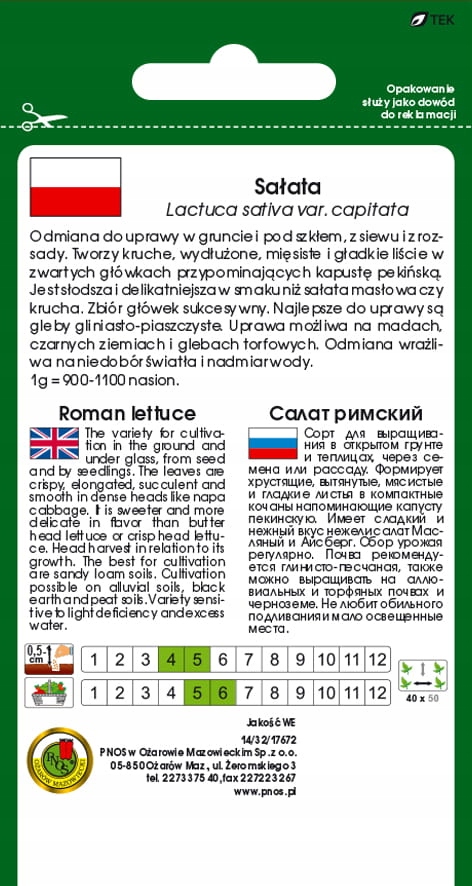 Набор голов последовательно. Глиняные и песчаные почвы являются лучшими для выращивания римского салата. Можно культивировать на мадах, черных землях и торф. Разнообразие чувствителен к дефициту света и избыточной воде. Номер семян: 900 - 1100 ПК. В Граменорме Сева: 0,2 - 0,3 кг/Хатермин.