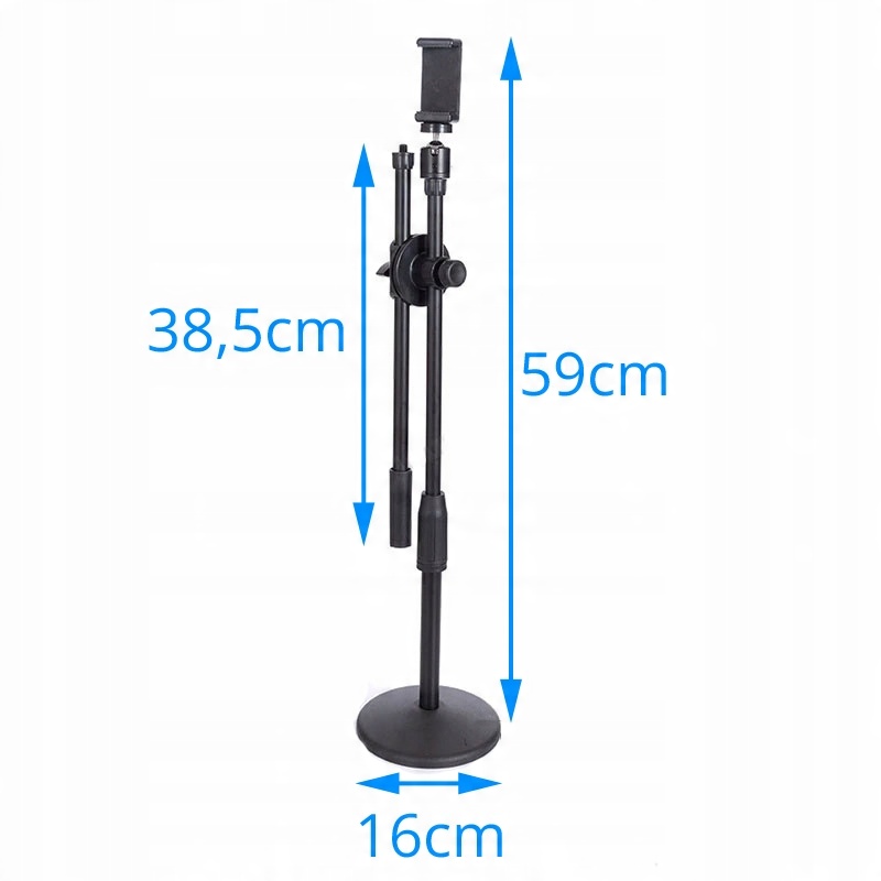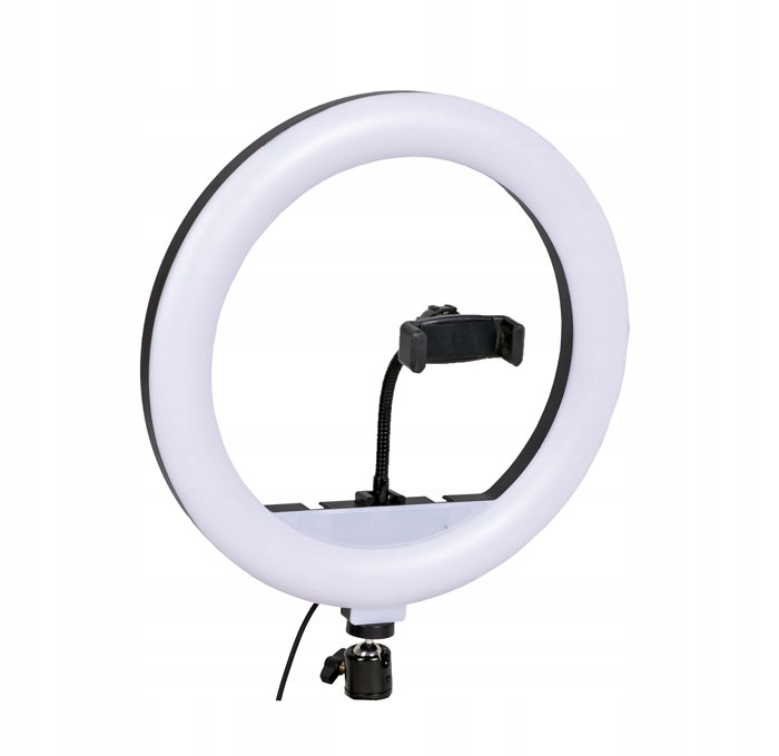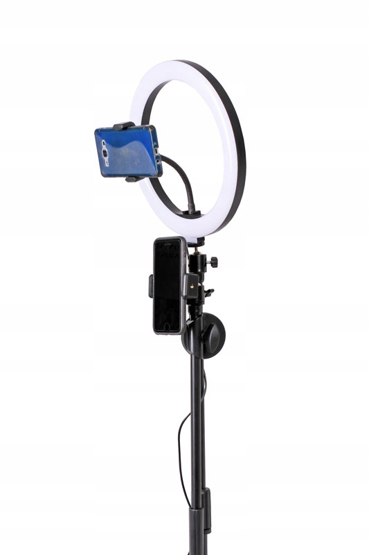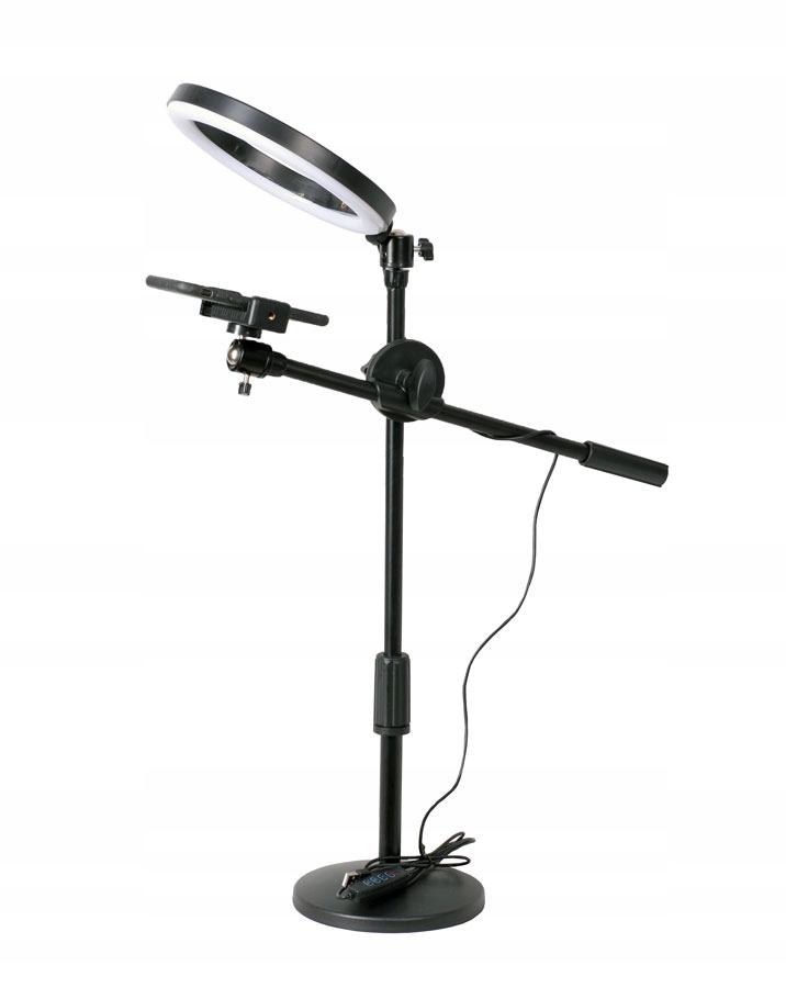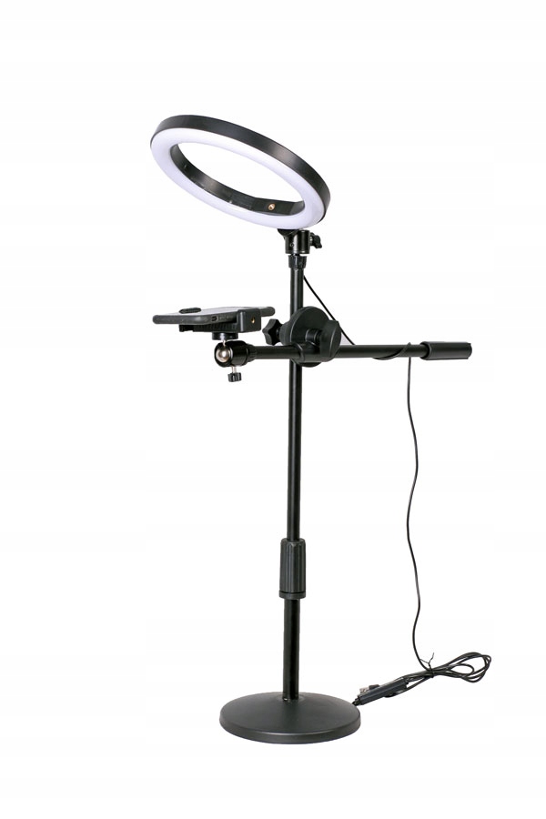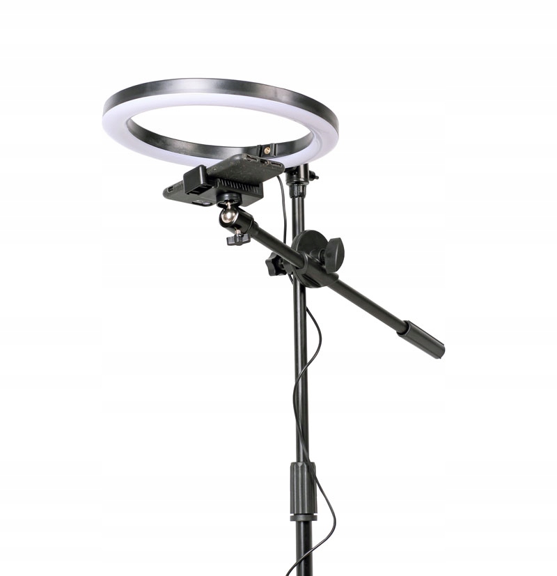 Комплект состоит из компактного, легкого кольцевого светильника (RING) диаметром 26 см и b>регулируемый штатив со штангой, с держателем для телефона.