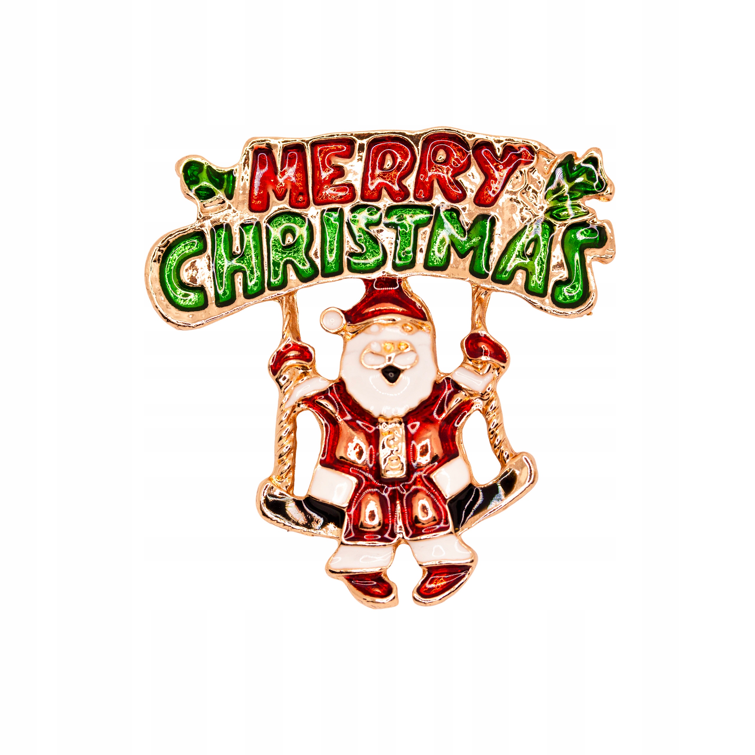 РОЖДЕСТВЕНСКАЯ БРОШЬ ЗОЛОТАЯ ШПИЛЬКА САНТА НА КАЧЕЛЯХ С РОЖДЕСТВОМ