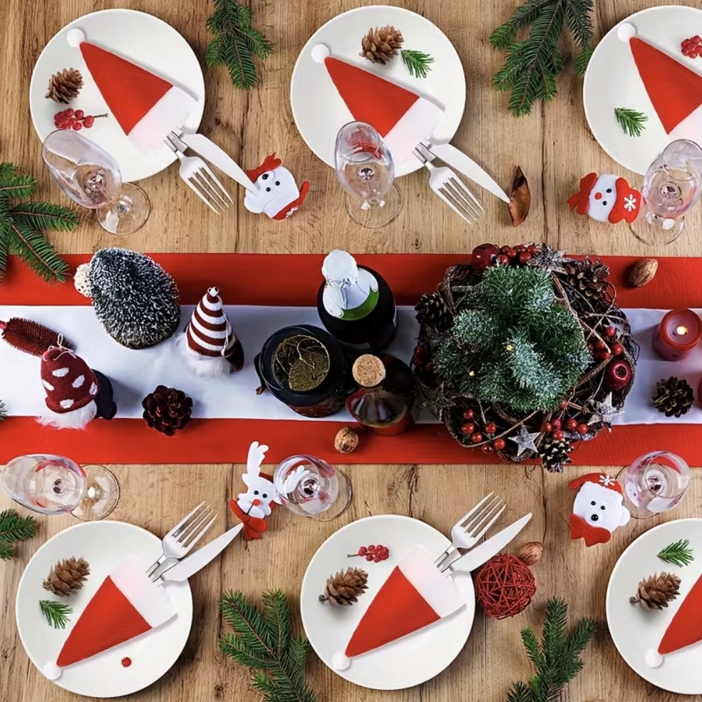 Новогодние столовые приборы в Форма шапки Санты – идеальный способ придать неповторимый шарм сервировке стола. Красно-белые шапки с помпоном смотрятся чрезвычайно эффектно и сразу создают уютную, радостную атмосферу. Они хорошо подойдут как во время семейного рождественского ужина, так и для корпоративных рождественских встреч или украшения столана зимних вечеринках.