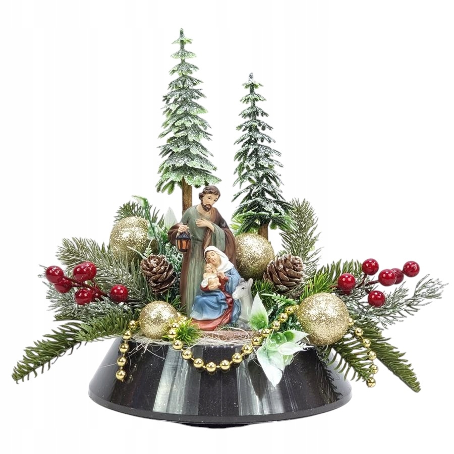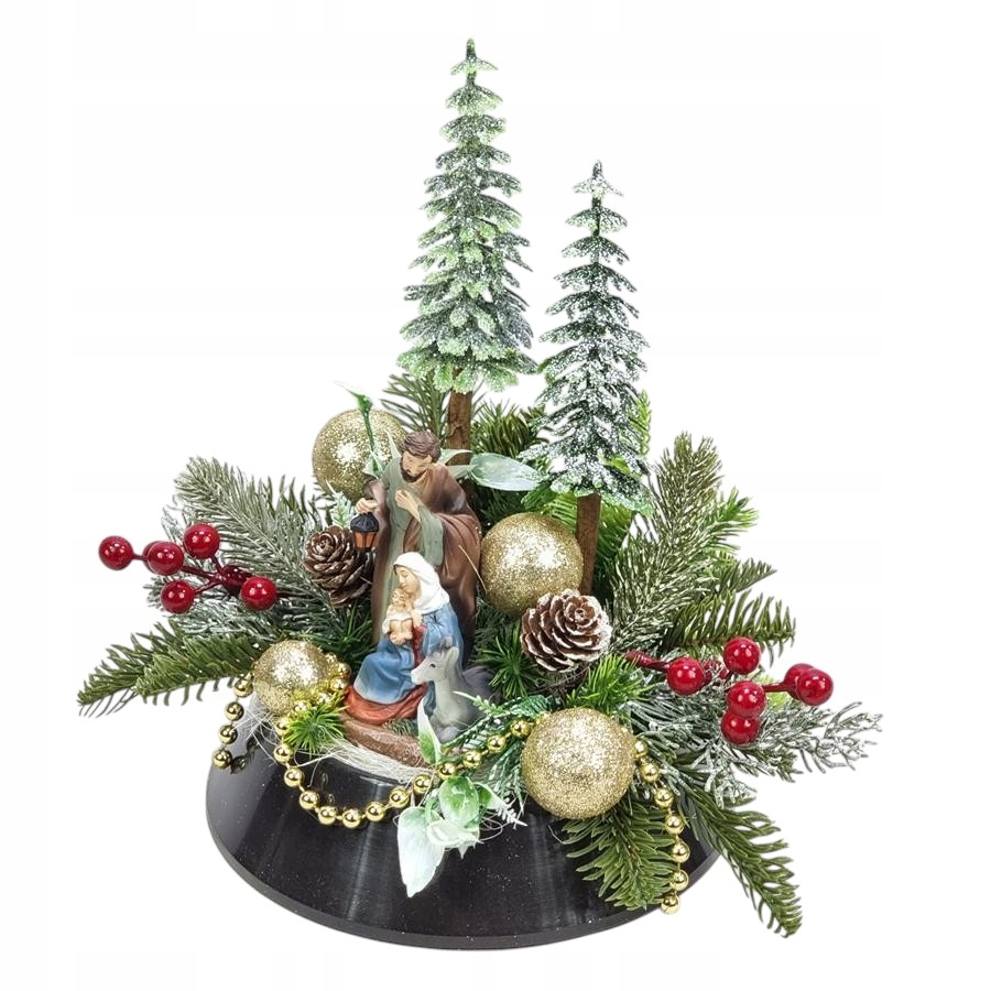 Красивое рождественское украшение; Святое Семейство, елочки, игрушки и множество интересных аксессуаров. Композиция в утяжеленной черной чаше. Все выглядит великолепно.