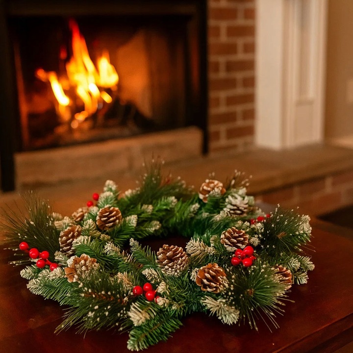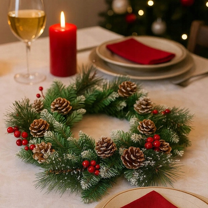 Это очаровательное Рождество венок диаметром 50 см - прекрасный способ украсить дверь, стену или стол. Изготовленное из плотных зеленых веток, украшенное красными лепестками, бантиками и шишками, оно привнесет в интерьер волшебное, рождественское настроение.