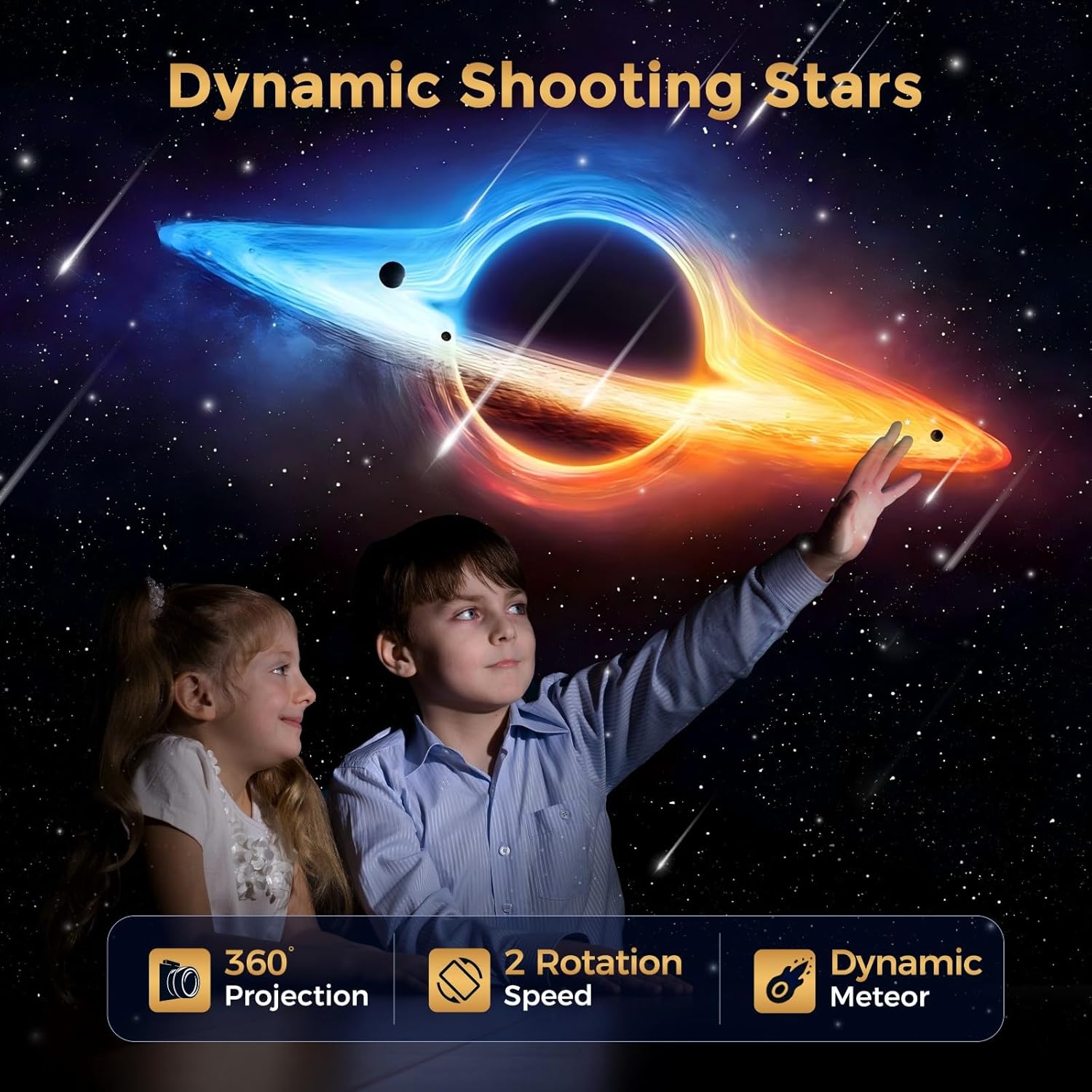 Изображение высокого разрешения с динамическими метеорами Проектор для домашнего планетария MERTTURM позволяет погрузиться в свет Вселенной, представляя живое, яркое и четкое изображение с высоким разрешением. Динамический эффект метеора добавляет элемент непредсказуемости и неожиданности в проекцию. Максимальная площадь проекции превышает 24 м², а максимальная высота проекции превышает 3 метра.