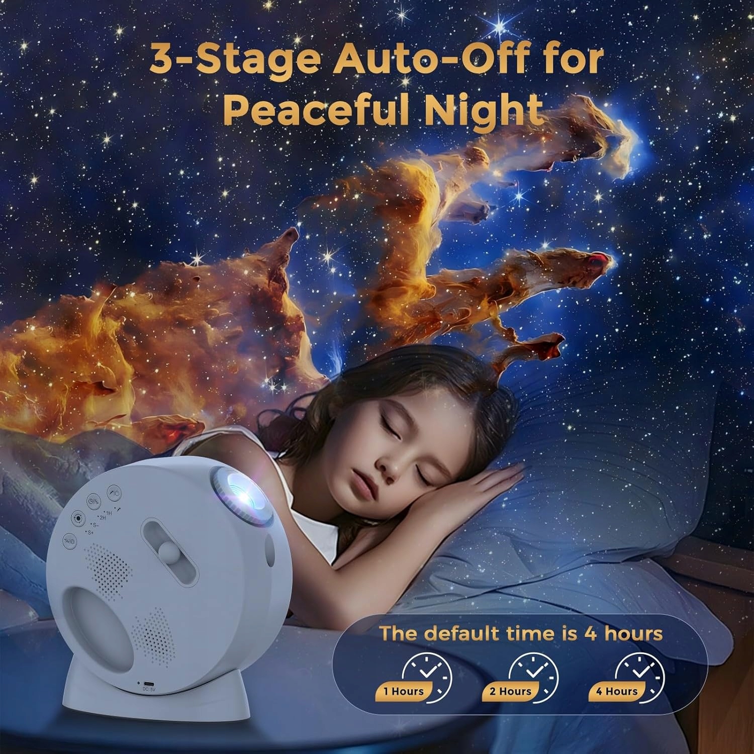 Таймер сна на 1 час/2 часа. Автоматический таймер (1 час/2 часа) позволяет автоматически выключать проектор. Альтернативно, устройство отключается каждые 4 часа работы, чтобы защитить его от перегрузки. Не волнуйтесь, если вы забудете выключить свое устройство! Различные настройки скорости вращения расширяют возможности использования в качестве ночника и оптимизируют качество просмотра для вас и вашей семьи.