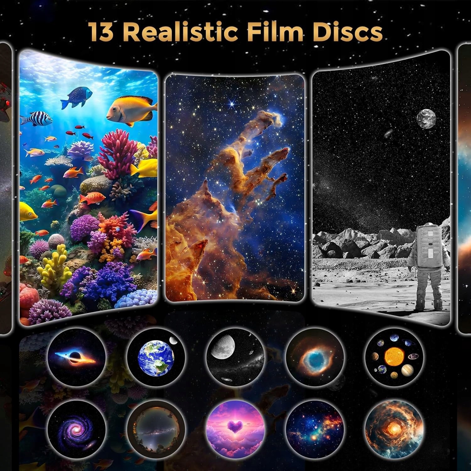 Набор из 13 дисков с изображениями Проектор галактик-метеоров для спальни MERTTURM включает 13 дисков с содержимым, в том числе: Земля, Черная дыра, Морской организм с далекой родины, Луна, NGC7293, Столпы творения, Солнечная система, Спиральная галактика, Млечный Путь, День святого Валентина, Сверхскопление Девы, Червоточина.