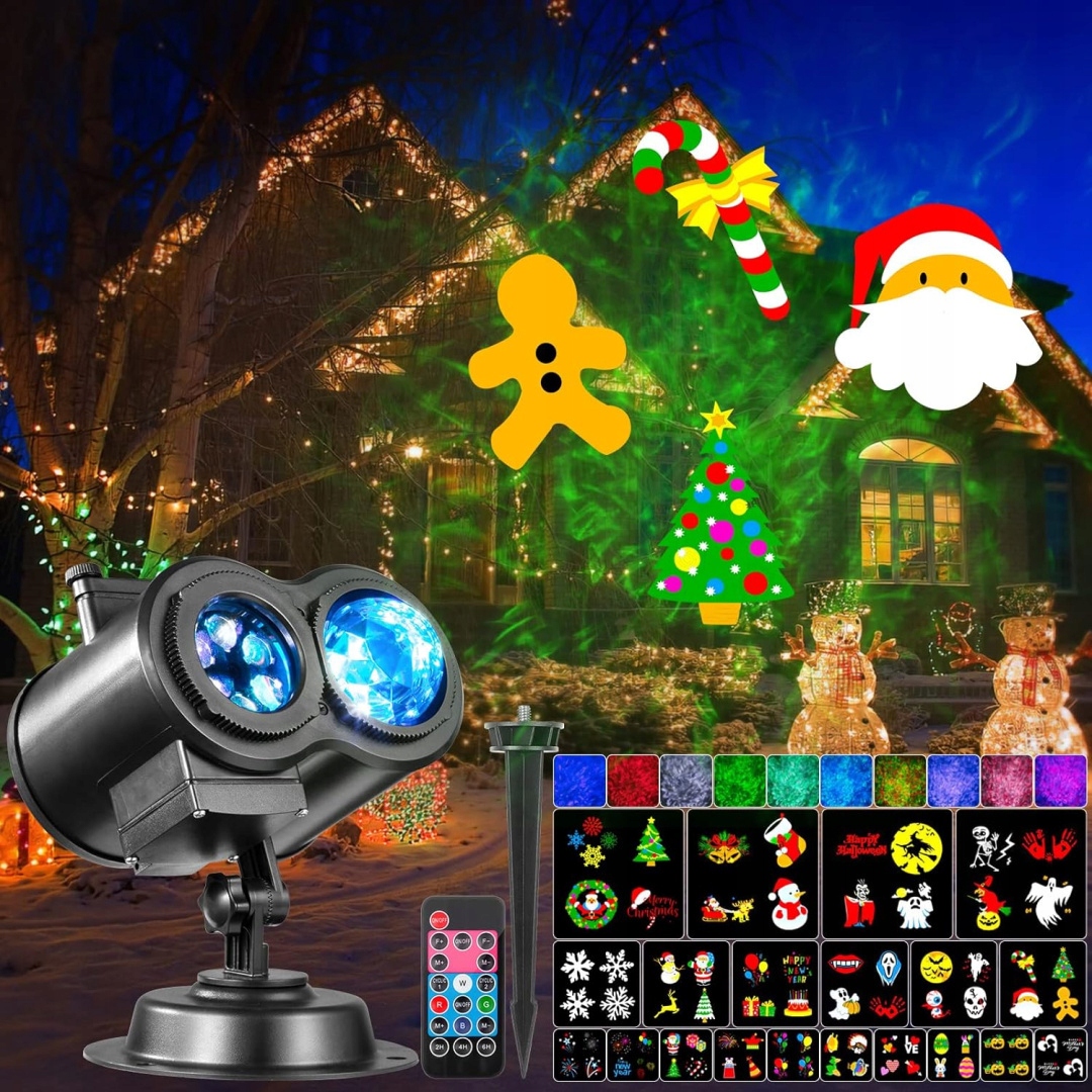 Светодиодный проектор оснащен двумя проекционными головками: одна для эффекта водной волны RGBW, а другая для проецирования изображения узора. Новейшие, разнообразные, красочные слайды для Хэллоуина, Рождества, Пасхи и многих других случаев.