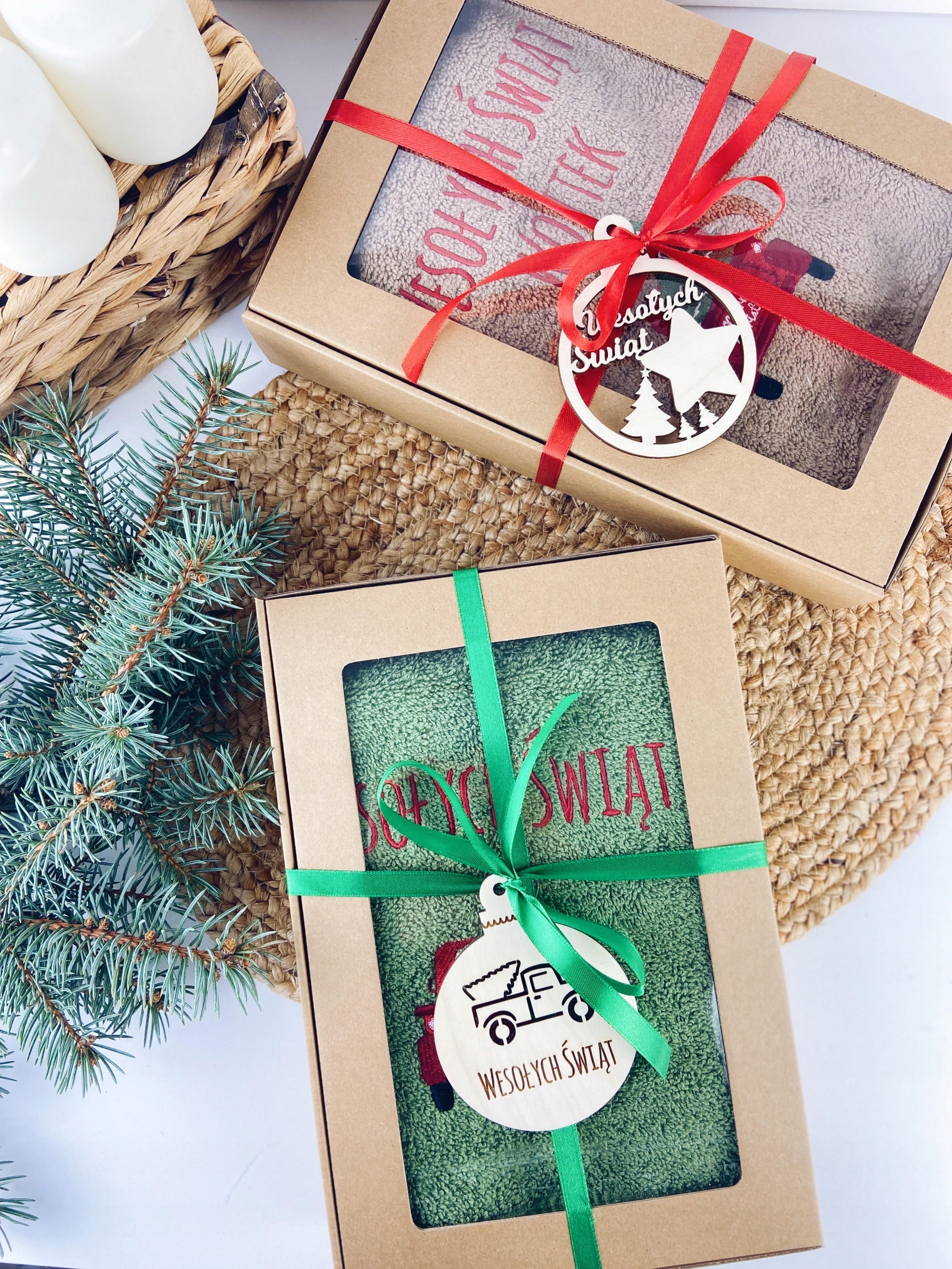 Полотенце упаковано в оконную коробку, перевязанную лентой и рождественской безделушкой.