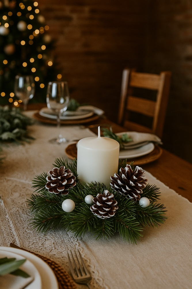 Композиция выполнена из зеленой искусственной хвои, дополнена белой фурнитурой, расписанными вручную шишками и жемчугом. Центральный элемент — парафиновая свеча (6×8 см) со временем горения ок. 15 часов, чтобы украшение было не только красивым, но и практичным.