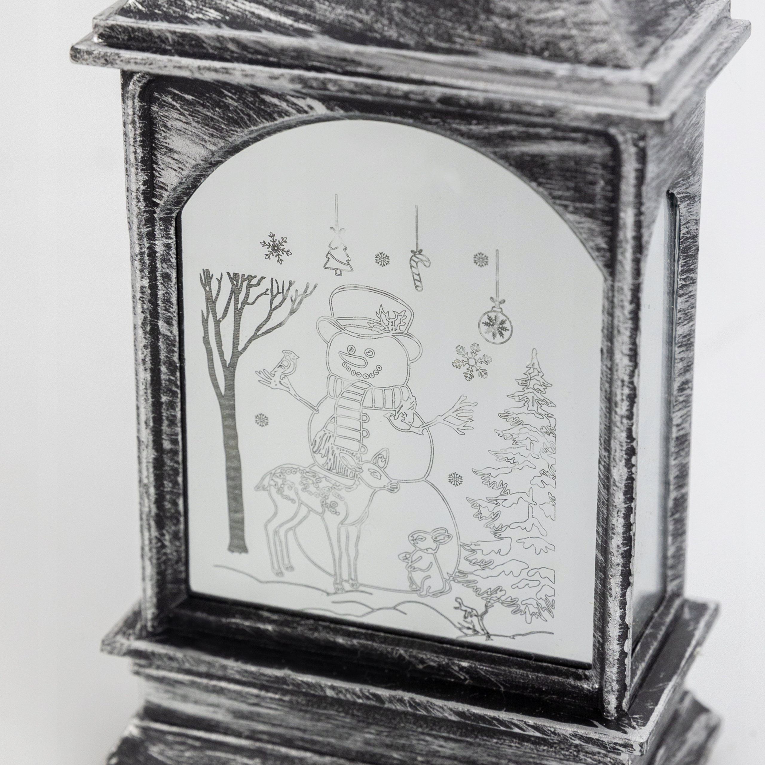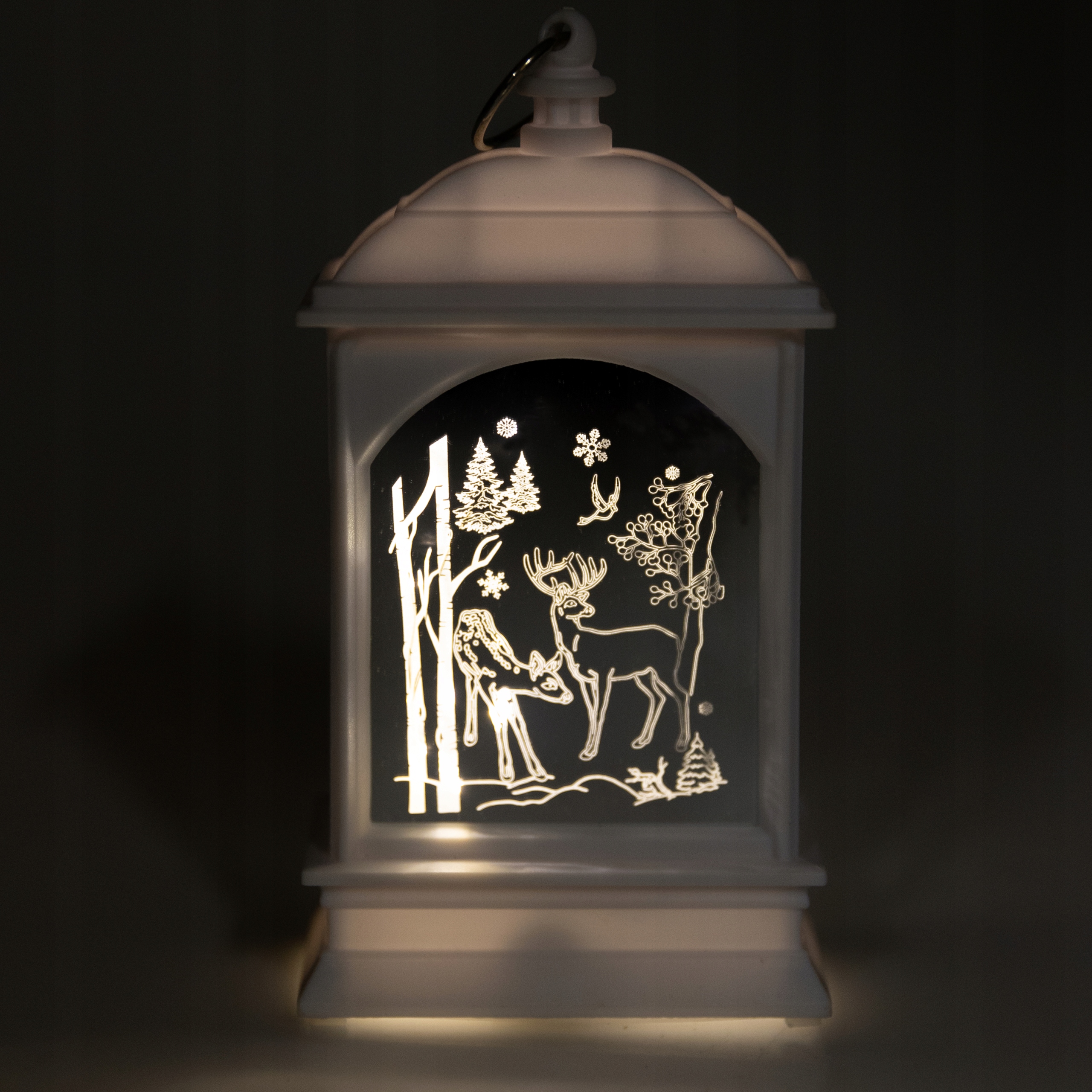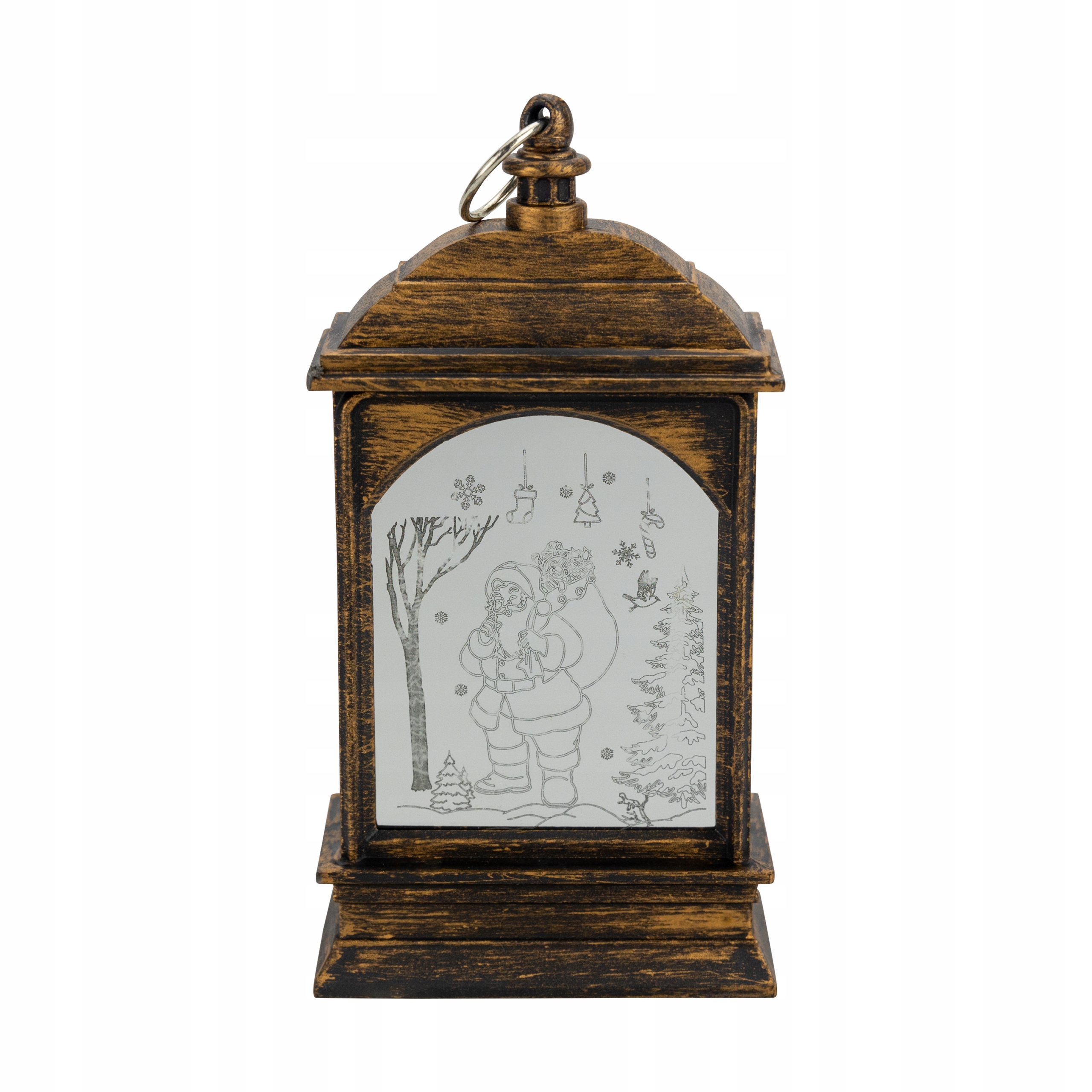 Рождественский фонарь с питанием от трех батареек LR44 (в комплекте). Прекрасно подойдет как отдельное украшение, так и как элемент новогоднего декора. Фонарь светит нейтральным светом благодаря мощному светодиоду. На обеих сторонах выгравированы зимние и рождественские иллюстрации. Его можно разместить на шкафу, камине, столе или повесить благодаря специальной петельке, установленной сверху.