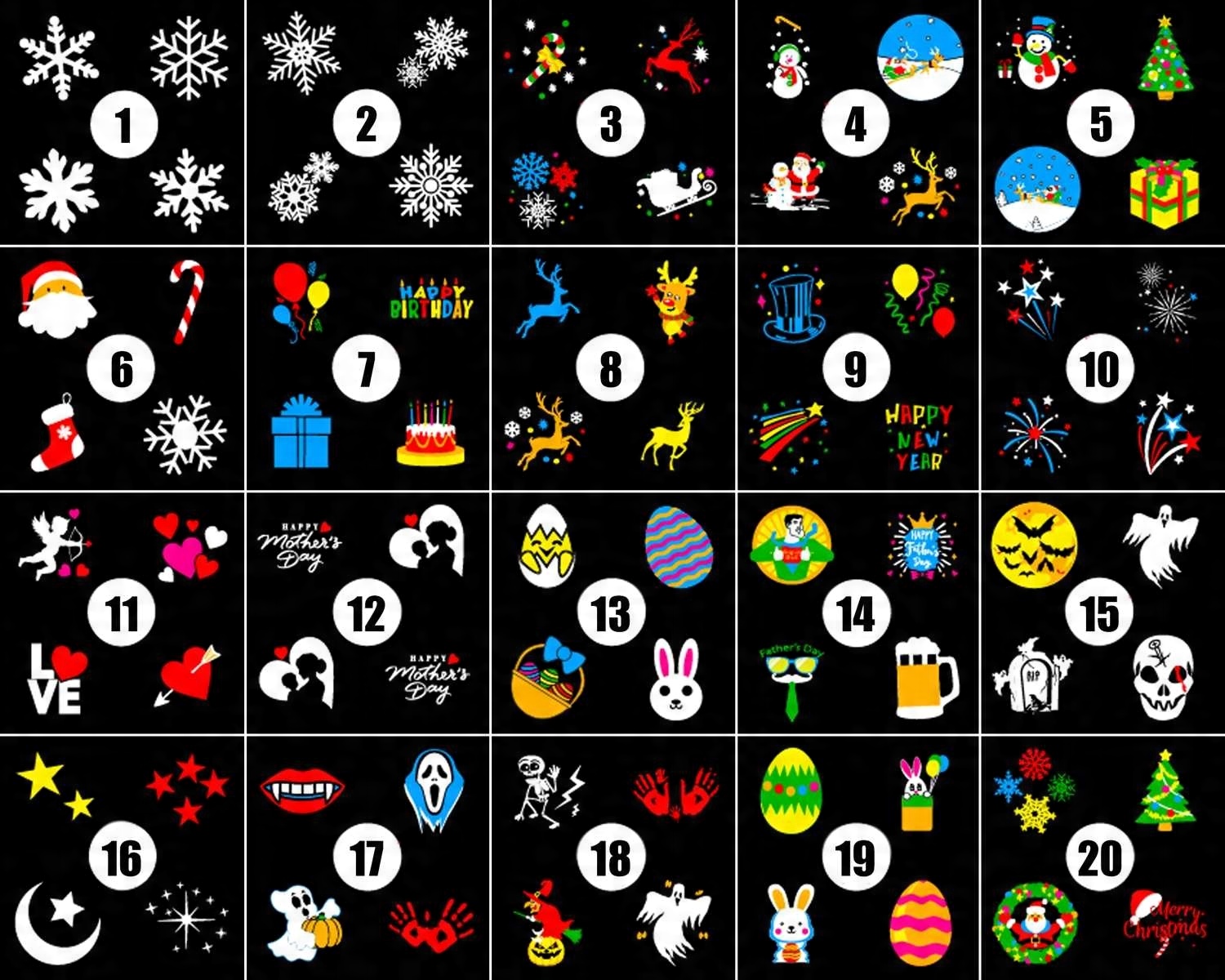 - НА КАЖДЫЙ СЛУЧАЙ - в проекторе целых 20 различных слайдов с картинки, относящиеся к таким праздникам, как: Пасха, Рождество, День святого Валентина, Хэллоуин, Женский день, День рождения, Карнавал, Новый год, День Святого Николая и другие. Благодаря своей универсальности его можно использовать постоянно, независимо от времени года и случая.