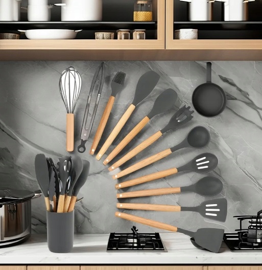 XXL НАБОР КУХОННОЙ ПОСУДЫ ДЕРЕВЯННАЯ СИЛИКОНОВАЯ 12 ЭЛЕМЕНТОВ