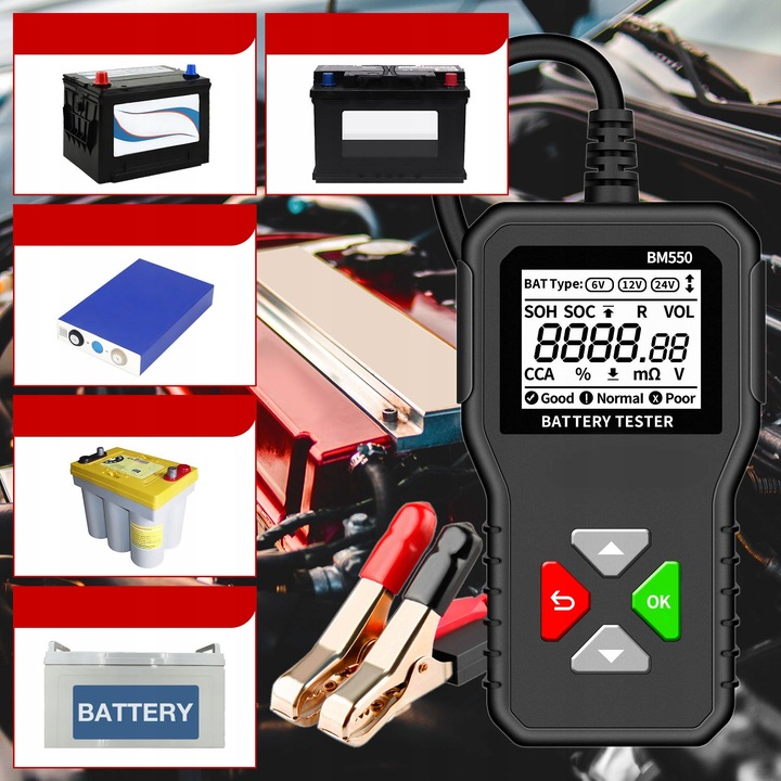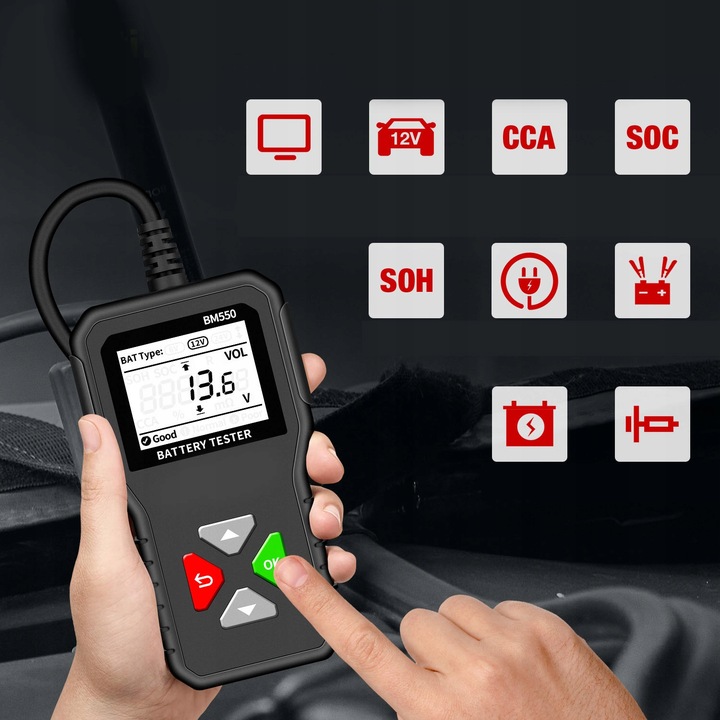 поддерживает требования к тестированию автомобильных батарей с различными уровнями напряжения 6 В, 12 В и 24 В и может тестировать SOC, SOH, внутреннее сопротивление, напряжение, значение CCA и другая информация.