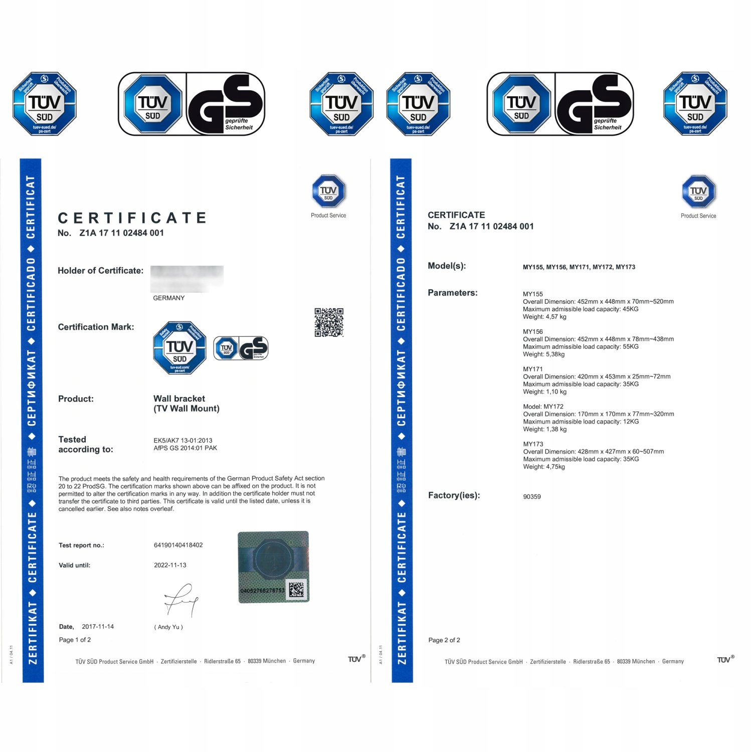 - Сертификат TÜV SÜD GS (проверена безопасность)