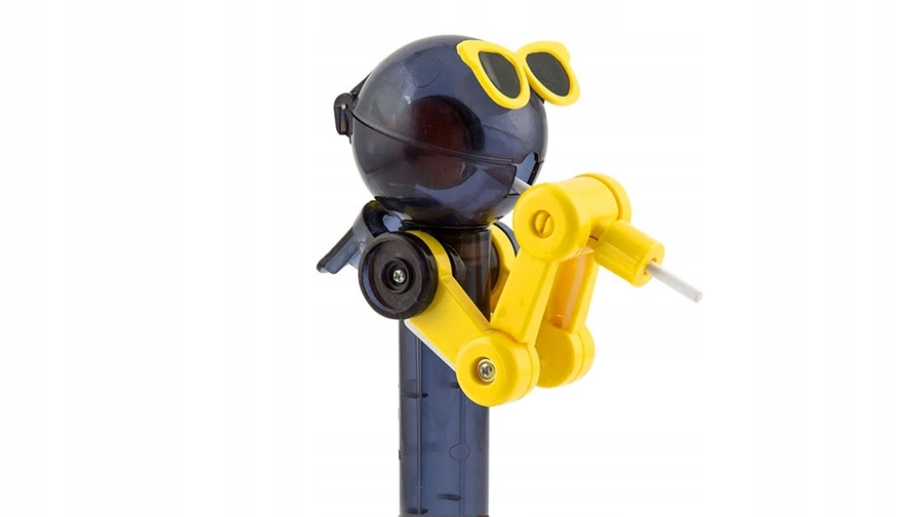 Принцип работы очень прост! Просто нажмите кнопку на спине, и робот вытянет руки. Вставьте леденец (неважно какой марки, подойдут все шариковые) в ручки и отпустите кнопку. Робот спрячет леденец в своей голове. Вы хотите вынуть это? Нажмите кнопку еще раз. Это очень просто, а само движение очень забавное.