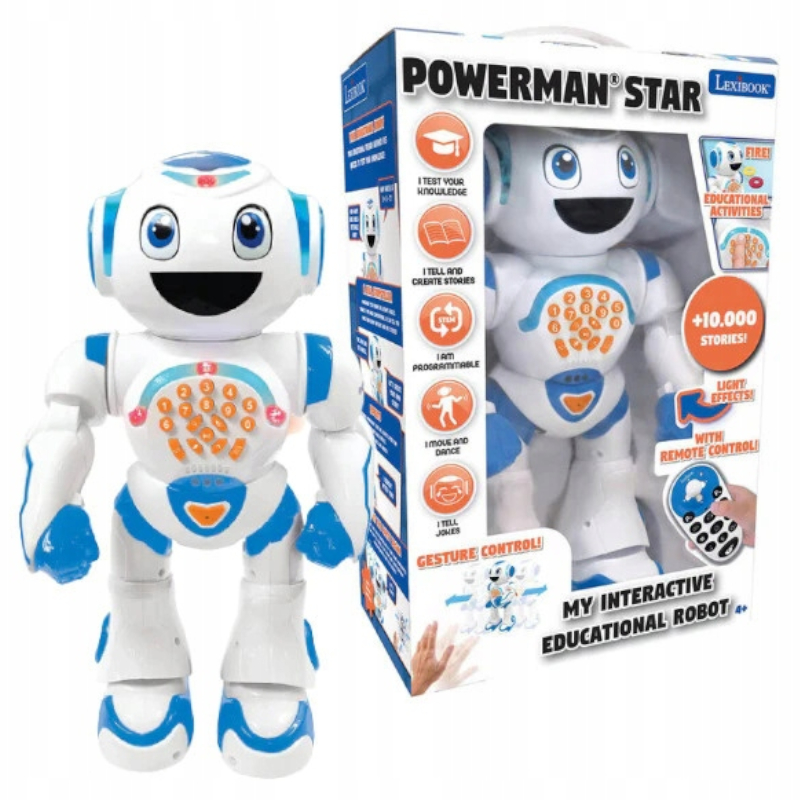 Powerman Star — это наиболее полная версия, содержащая более 300 обучающих викторин и 6 образовательных функций. Польскоязычный робот для детей говорит, имитирует движения, играет музыку и оснащен множеством световых и звуковых эффектов. Кроме того, благодаря создателю историй ваш ребенок может создавать до 10 000 историй. сумасшедшие и смешные истории, а также 10 басен Эзопа, которые, как знает робот, идеально подойдут для засыпания.