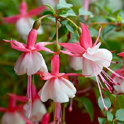 у фуксий есть характерные, колокольчивые цветы, которые могут быть разных цветов, чаще всего в оттенках розового, фиолетового, красного и белого. Часто встречаются разновидности с двумя цветами, что дополнительно подчеркивает их декоративность. Эти цветы обычно подвешены на тонких стебли, создавая эффект подвесных каскадов цветов. Листья фуксии являются эллиптическими, темно -зелеными и блестящими, что является хорошим фоном для ярких цветов.
